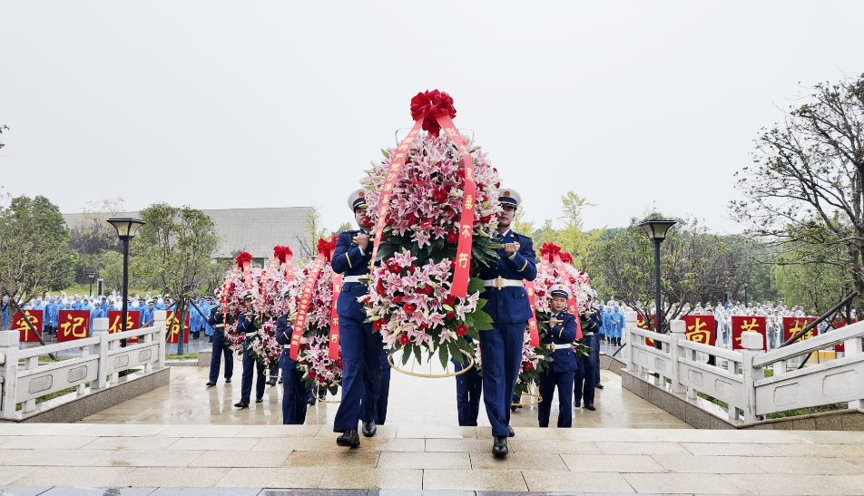 苍松翠柏掩映下的烈士陵园庄严肃穆,革命烈士纪念碑巍然矗立。上午9时,烈士纪念活动正式开始。全体人员奏唱中华人民共和国国歌,庄严雄壮的歌声飘扬在烈士陵园上空。国歌毕,全场肃立,向革命烈士默哀。随后,少先队员齐声献唱《我们是共产主义接班人》,表达传承革命先辈光荣传统、追寻烈士足迹前进的远大志向。伴随着深情的《献花曲》,14名礼兵双手托起花篮缓步走向革命烈士纪念碑,摆放在纪念碑基座上。陈威缓步上前,仔细整理花篮缎带,敬献了鲜花并瞻仰纪念碑。随后,参加纪念活动的全体人员依次上前,敬献手中鲜花,绕纪念碑一周瞻仰革命先烈,共同缅怀为国家、为民族而英勇牺牲的革命先辈,寄托对烈士们的无限哀思。