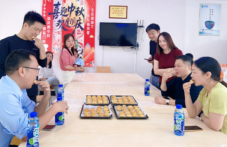 活动现场,烘焙师傅详细演示月饼制作方法。员工们戴上围裙、手套,在师傅指导下将面粉变成圆球,再用模具压制。30 分钟后,一个个形状各异的月饼诞生了。在中秋知识答题环节,大家踊跃抢答,现场气氛热烈。