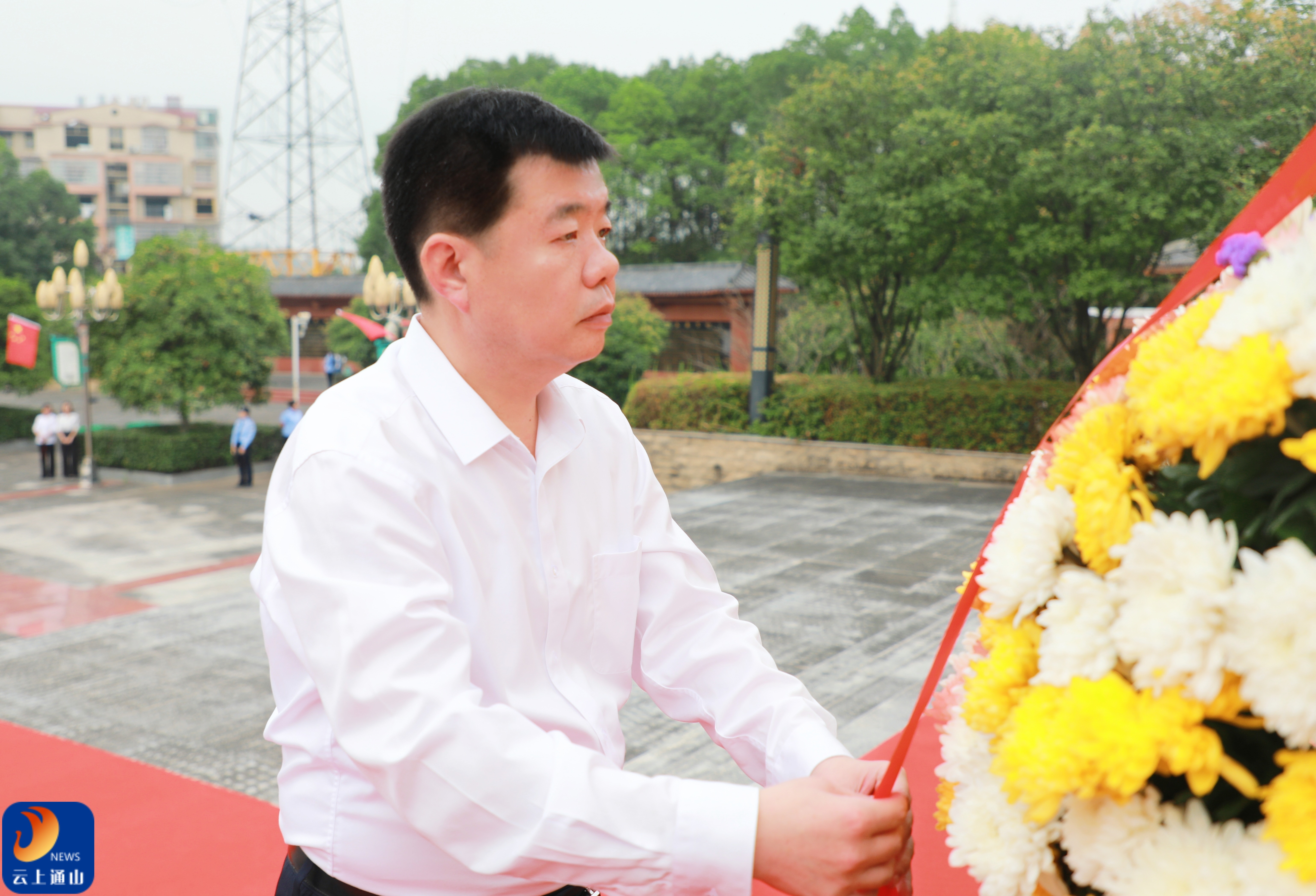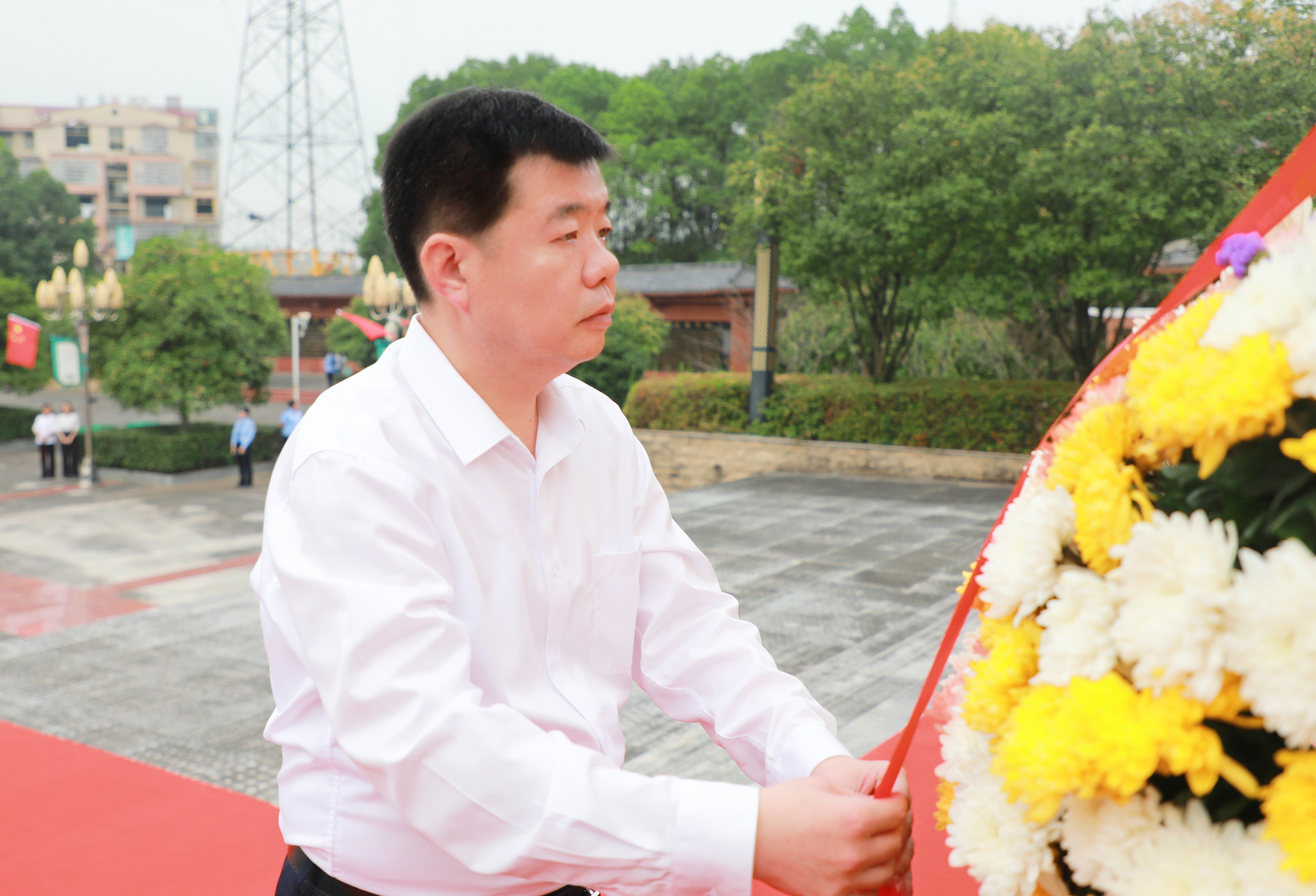 ▲通山县委书记、县长吴涛仔细整理花篮缎带。