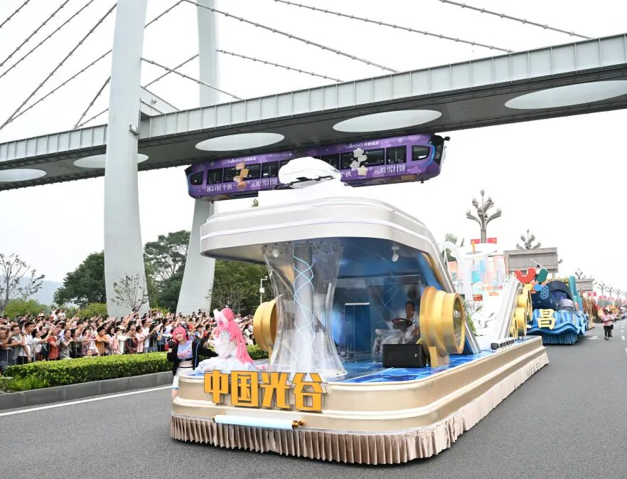 地市州花车方阵中,“中国光谷”花车极具现代感,由前后两座岛屿组成,汇聚武汉新能源研究院大楼、光谷空轨、无人机等科技元素,以大量光线条贯穿。
