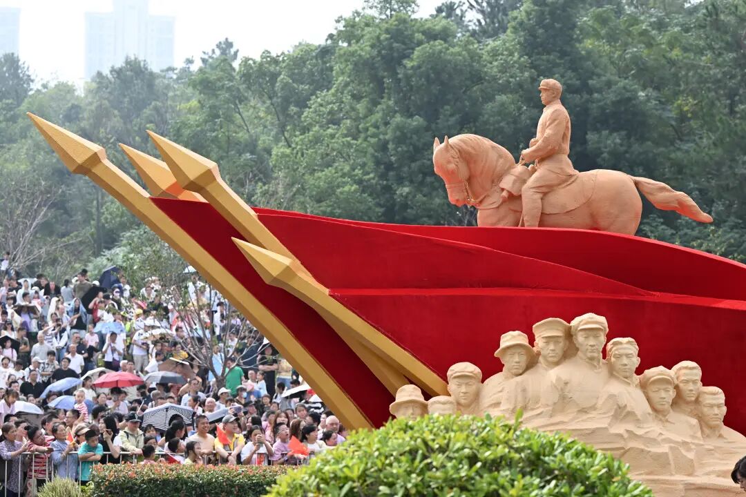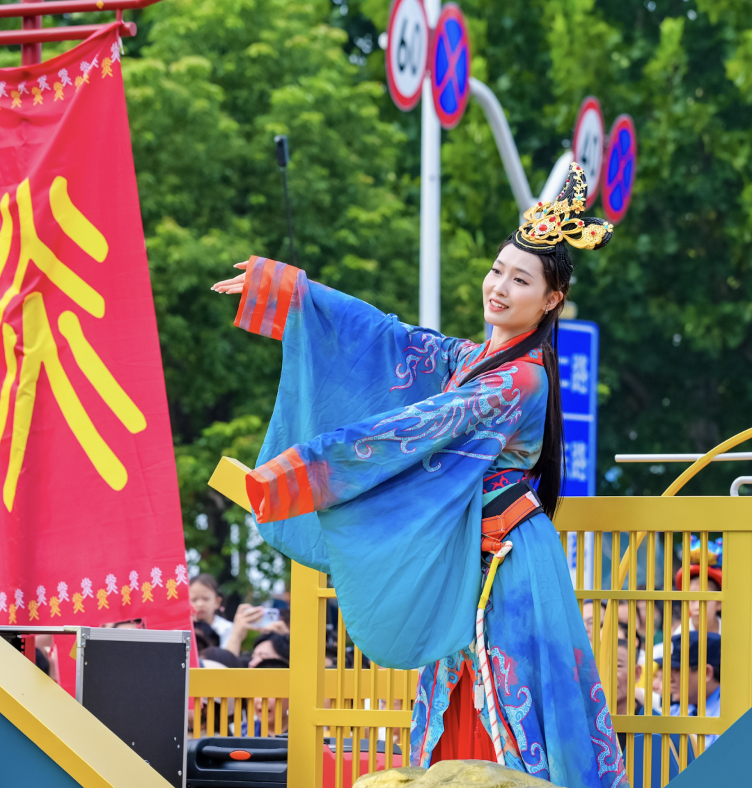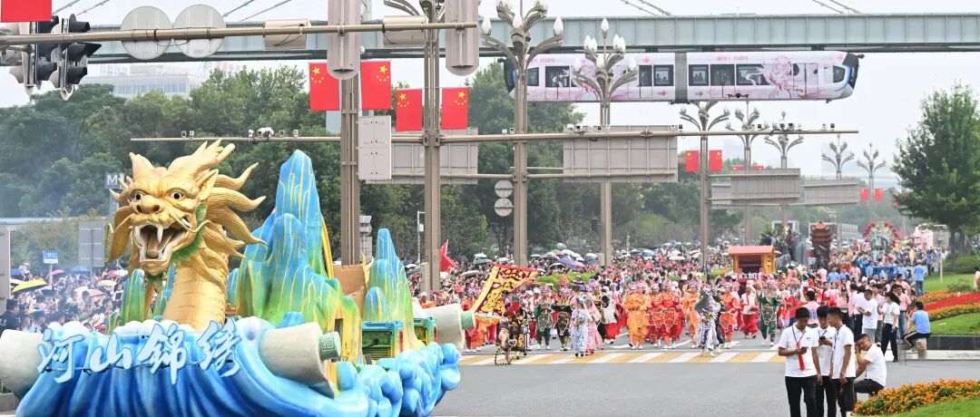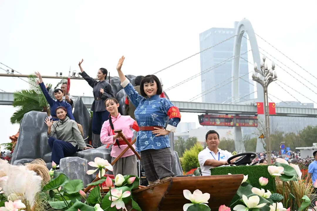 其中,“河山锦绣”主题花车像一座行走的《千里江山图》,融合了仿真龙头、长城等元素,再现源远流长、博大精深的中国传统文化。