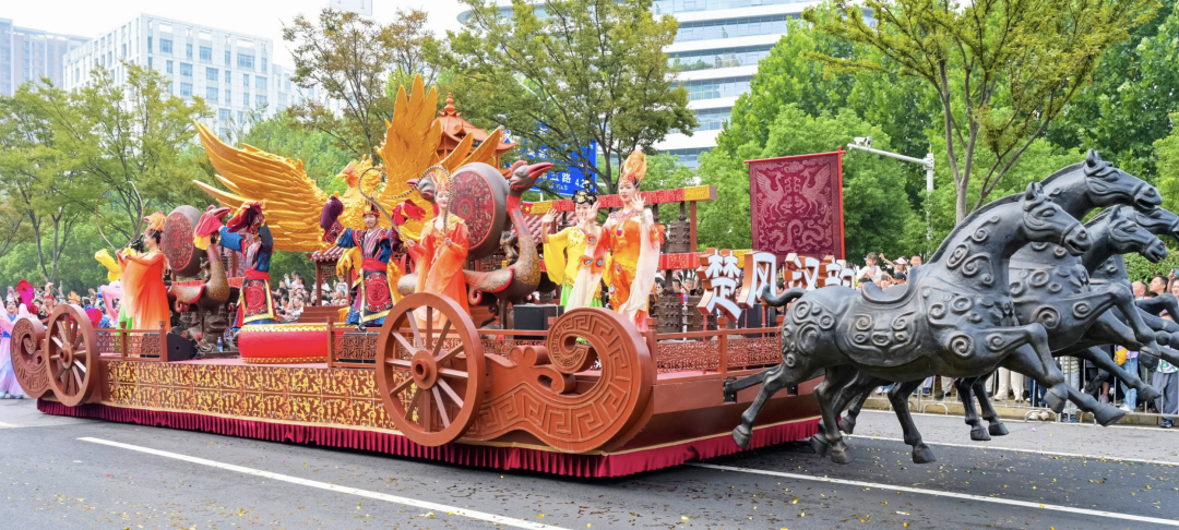 “楚风汉韵”主题花车如一只展翅飞翔的凤凰,以红色古屋为底座、编钟为羽翼,并浓缩黄鹤楼、虎座鸟架鼓等荆楚元素,展现湖北特色文化。