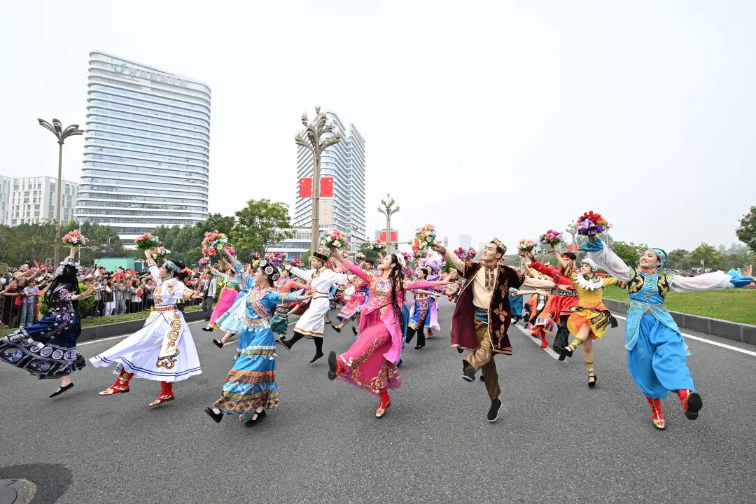在高新大道与光谷四路十字路口,演员现场跳起广东英歌舞、安塞腰鼓、山南藏戏、新疆十二木卡姆等传统舞蹈,楚舞《凤舞楚天》、土家舞《西兰卡普》、神农架梆鼓、《知音号》等楚风舞蹈轮番上演,还有海外团队表演异国风情浓厚的桑巴舞、非洲鼓。光谷空轨不时在舞台上空呼啸而过,科技与人文交织。