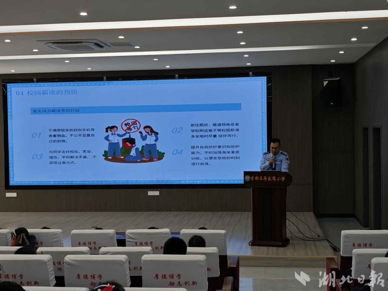 湖北日报讯(通讯员刘智明、柳鹏辉)为进一步筑牢校园法治防线,守护未成年人健康成长,9月24日,随州市公安局曾都分局东城派出所民警走进辖区蒋家岗小学,开展以“与法同行,守护成长”为主题的“法治进校园”活动。该校二至六年级学生代表齐聚学术报告厅现场聆听,其余学生在班级内同步收看直播,共赴一场生动的法治“必修课”。
