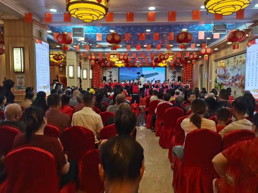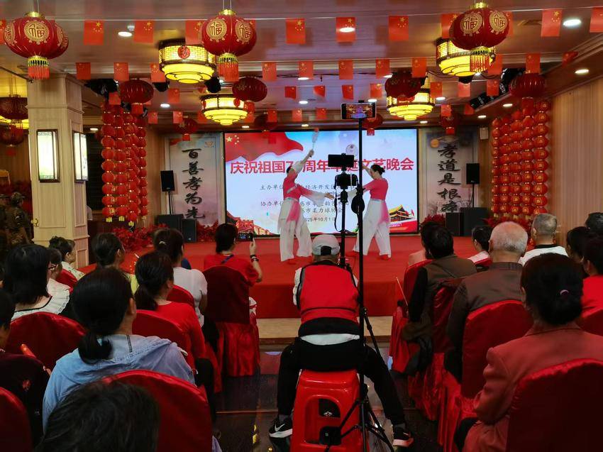 随着节目正式拉开帷幕,现场掌声与欢呼声此起彼伏。特色柔力球表演中,队员们身姿矫健、动作流畅,球拍上的彩球随节奏灵动翻飞,既展现出居民积极健康的精神风貌,也传递出对美好生活的热爱;孝道禅舞表演韵味十足,舞者身着素雅服饰,以舒缓优美的舞姿诠释传统孝道文化,让在场观众在沉浸式观赏中感受中华优秀传统文化的魅力;一个个精彩节目相继上演,现场气氛热烈而欢快。压轴登场的大合唱《歌唱祖国》更是将晚会气氛推向高潮,演员与观众自发起立,挥舞着手中的小国旗,共同唱响对祖国的无限热爱与美好祝福,嘹亮的歌声回荡在大厅每一个角落,汇聚成同心向祖国的真挚告白。