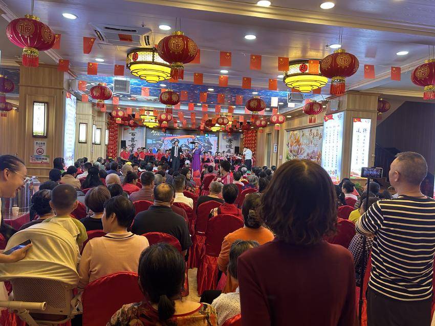 活动现场处处洋溢着喜庆热烈的节日氛围:宴会大厅内张灯结彩,鲜红的小国旗与亮眼的红灯笼交织悬挂,一抹抹“中国红”不仅扮靓了场地,更点燃了在场居民的爱国热情。晚会尚未开场,社区男女老少便早早齐聚一堂,大家脸上洋溢着笑容,相互问候、热切交流,期待着一场精彩的文化盛宴。