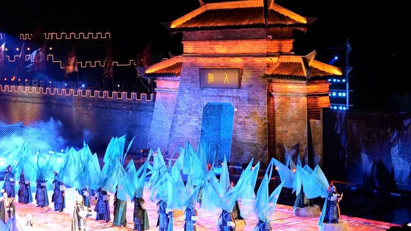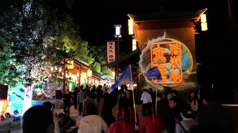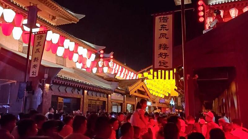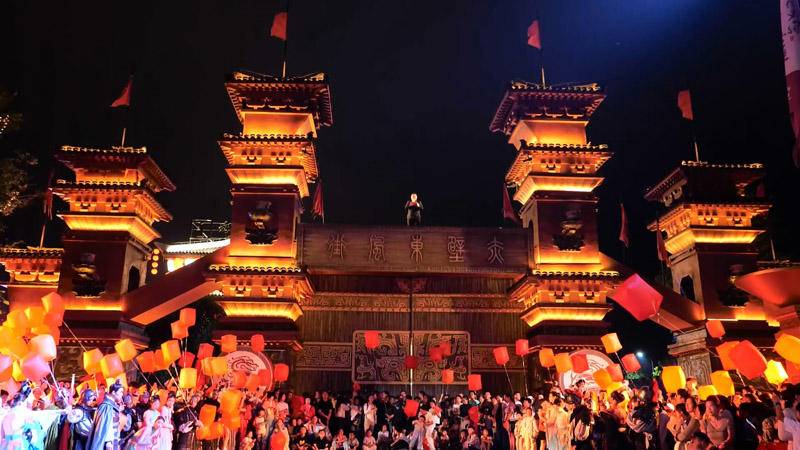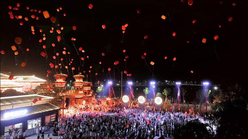 夜幕降临,赤壁古战场东风街灯火通明。随着战鼓擂响,1800年前的祈愿仪式重 现。“诸葛亮”登临“七星祭坛”,击鼓诵文,为家国祈愿。随后在“诸葛亮”的带领下,近万名游客手持孔明灯,一同点亮放飞。刹那间,夜空被点点灯火映照得如梦似幻,仿佛千年前的东风再次吹来,将游客瞬间带入波澜壮阔的三国梦境。