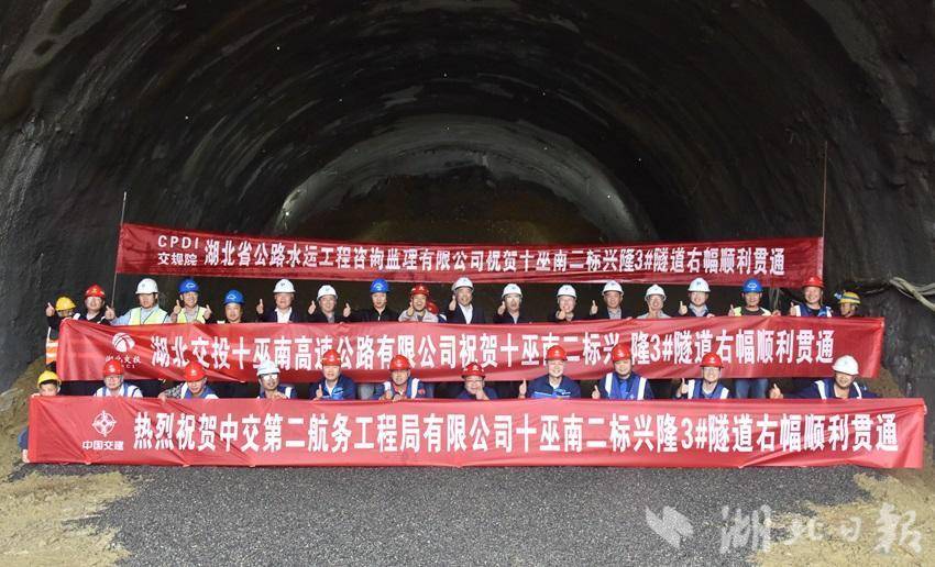 湖北日报客户端讯(通讯员李新新、李怀智、高海涛)“轰隆!”伴随最后一方岩体顺利凿通,10月2日,由湖北交投集团投资建设、中交二航局承建的十巫南高速公路兴隆3号隧道右幅成功贯通。