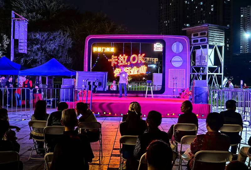 当晚7时许,东洲桥头下蒲圻古城拱极门广场灯火通明,露天舞台的射灯划破靛蓝夜空,一首首经典歌曲娓娓道来。参赛选手在擂台上放声高歌,用激昂旋律诉说对祖国安定繁荣的赞颂;观众席上掌声、欢呼声此起彼伏,大家跟着节奏轻轻哼唱,在熟悉的旋律中感受生活的美好与节日的喜悦。