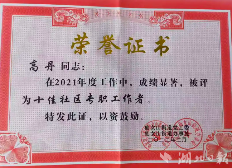 湖北日报客户端讯(通讯员李华)高丹是汉川市仙女山街道西湖路社区原第八网格的一名网格员。5年多来,她一遍又一遍地走访网格内的楼栋单元,被称为网格活地图、活档案;她坚持24小时服务在线,切实为居民排忧解难,成为网格平安的“硬核”守护者。2021年度,高丹被汉川市委政法委评为“平安建设优秀社区工作者(网格员)”;2021年度和2024年度,高丹两次被仙女山街道党工委、仙女山街道办事处评为“十佳社区专职工作者”。