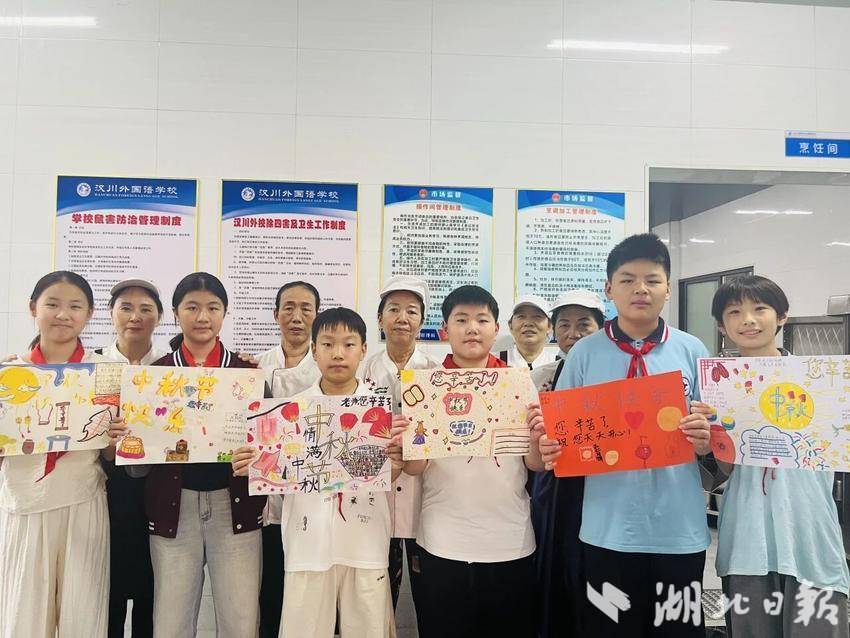 此外,汉川外国语学校小学部则以“传承文化、致敬劳动者”为主题,精心组织“礼传学子心·外校一家亲”中秋实践活动。学生们通过创作中秋主题手抄报、亲手制作月饼,深入体验传统文化魅力,并将这些满载心意的手抄报和自制月饼赠予校领导、保安、食堂阿姨等校园工作者,用稚嫩而真诚的话语表达感恩之情。活动将文化传承与劳动教育深度融合,让学生在实践互动中懂得感恩、理解传统,彰显了“以节育人”的教育理念,营造了温暖和谐的校园氛围。