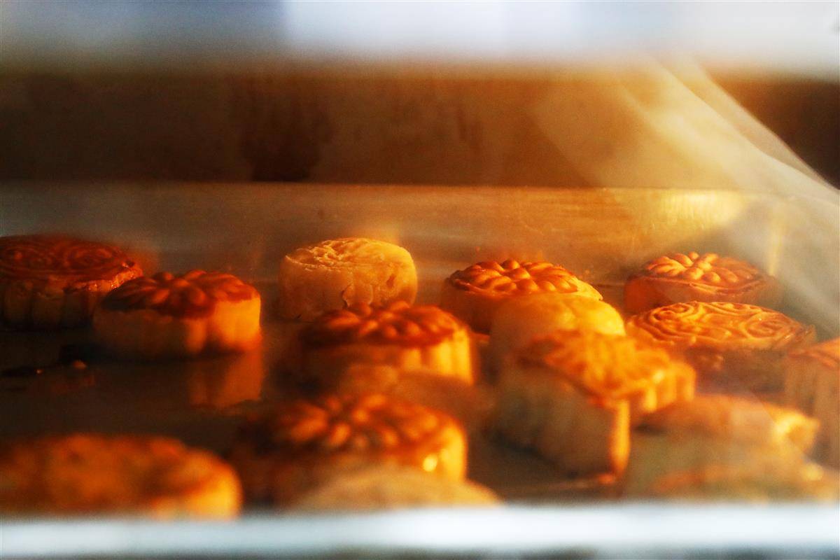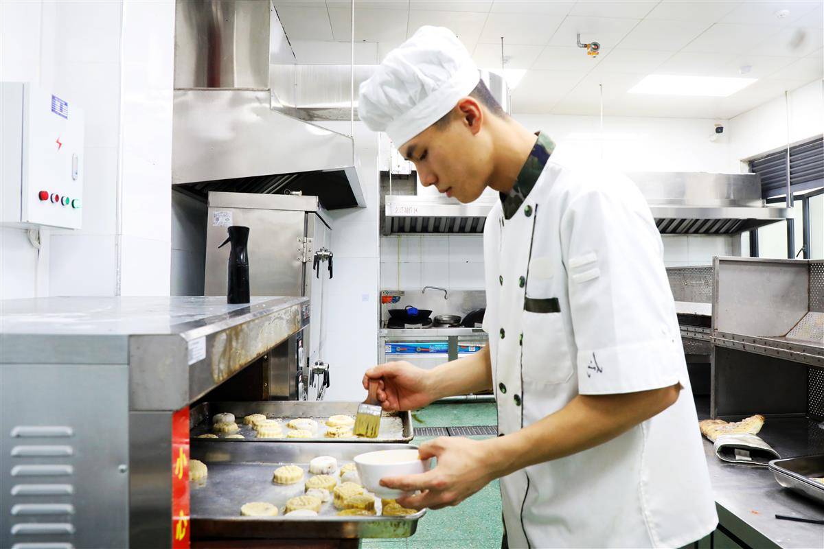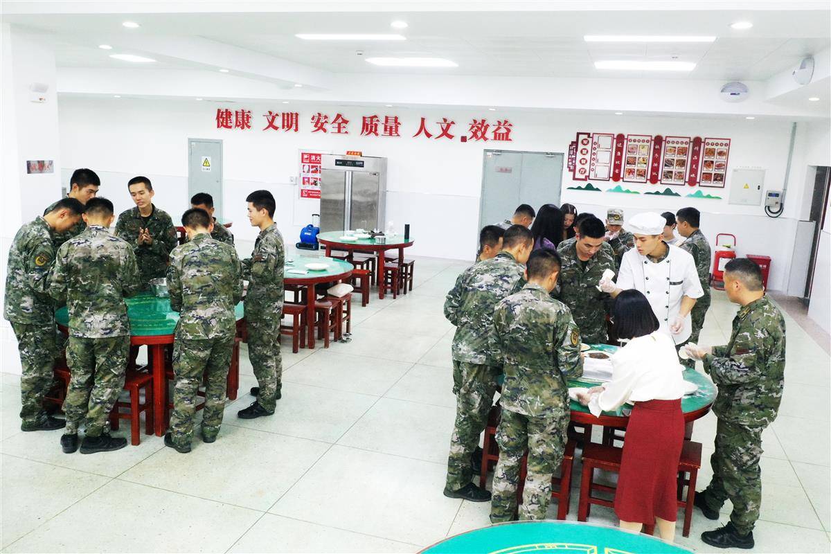 揉面、称重、包馅、烘烤……官兵们和家属欢聚一堂,在炊事员的指导下,学习月饼的制作方法,大家分工配合,不多时,烤箱内一个个独具军营特色的月饼,新鲜出炉。