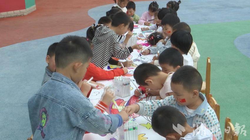 教室外,孩子们围坐着一幅巨型画卷,手持彩笔,兴致勃勃地为画卷填充色彩。他们用稚嫩的笔触描绘出国旗、明月、玉兔等元素,将对祖国的热爱和对中秋的期盼都融入这幅充满童趣的集体创作中。