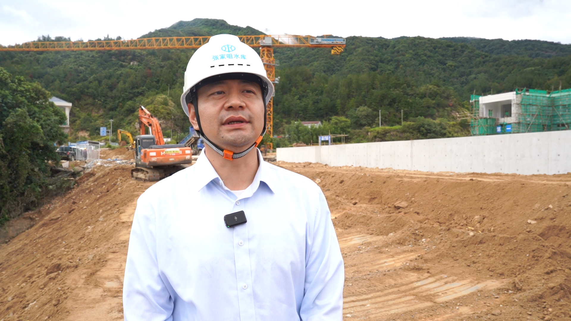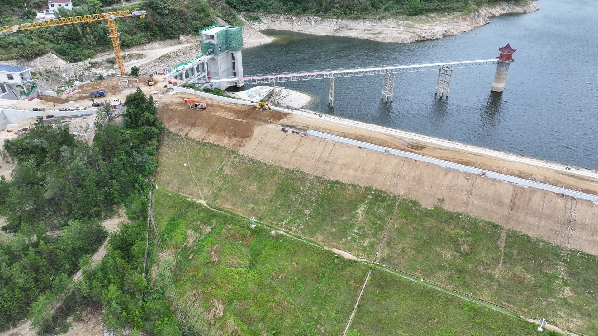 张家咀水库除险加固项目建设办公室技术负责人刘锦华:大坝坝体防渗墙和坝基的帷幕灌浆已全部施工完毕,主坝和副坝段的防浪墙已施工完成,新建溢洪道、进水塔及输水放空隧洞结构部分均已完成,目前正在施工的是坝顶路基回填压实和电缆沟施工等附属工程。