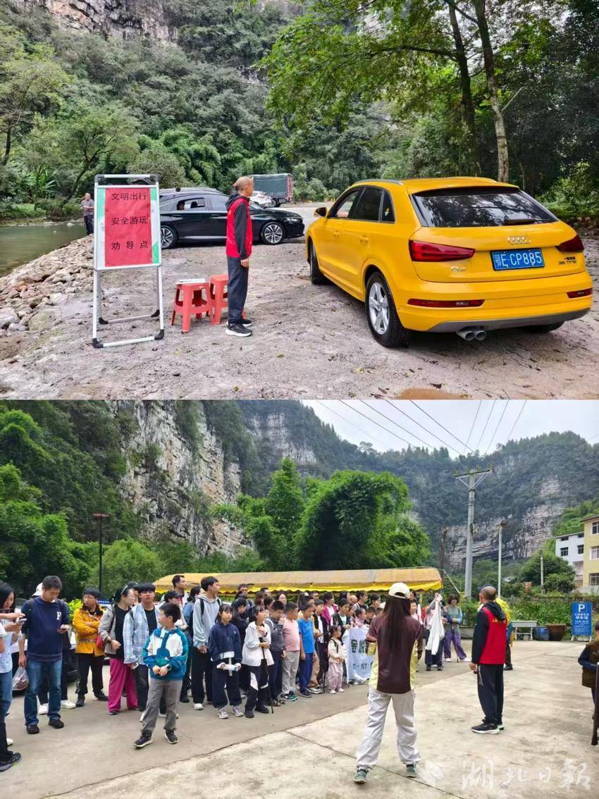 在景区显眼位置的“文明出行 安全游玩劝导点”,志愿者对车辆停放进行规范引导,向游客普及文明旅游和安全游玩知识。同时,针对研学团队、家庭游客等不同群体,志愿者们通过集中讲解、一对一提醒等方式,重点强调水域周边、山路行走等场景的安全注意事项,倡导大家爱护生态、文明游览。