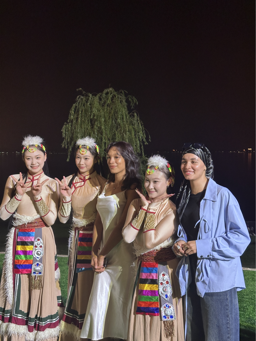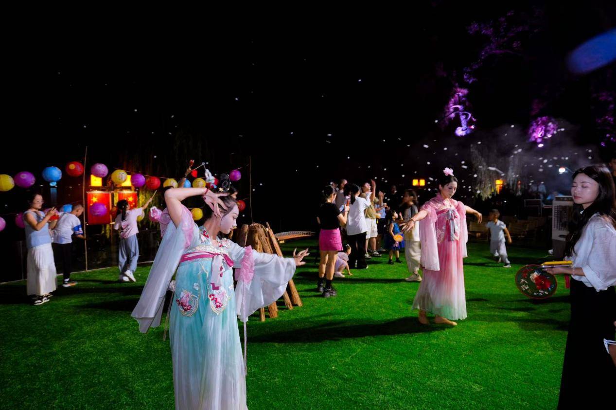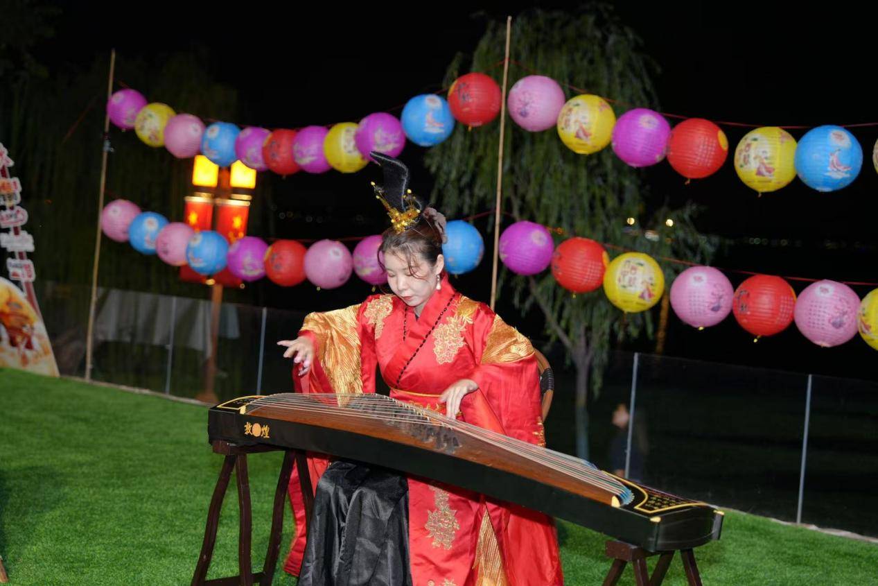 晚上7点,湖上琉璃餐厅前的亲水平台已聚满了期待的人群。古筝曲《但愿人长久》似清泉流淌,漫过阶梯式观景台。宾客倚坐在藤编椅间,杯中茶汤映着琉璃灯火,恍若置身湖心。倏尔月白纱衣翩跹,《广寒宫》乐声中“嫦娥”与“玉兔”踏水袖凌波,足尖轻点如揽月追云;《彩云追月》更将筝弦与舞姿交融,湖面倒影与天上玉盘重叠,韵味十足的开场表演赢得观众阵阵掌声。