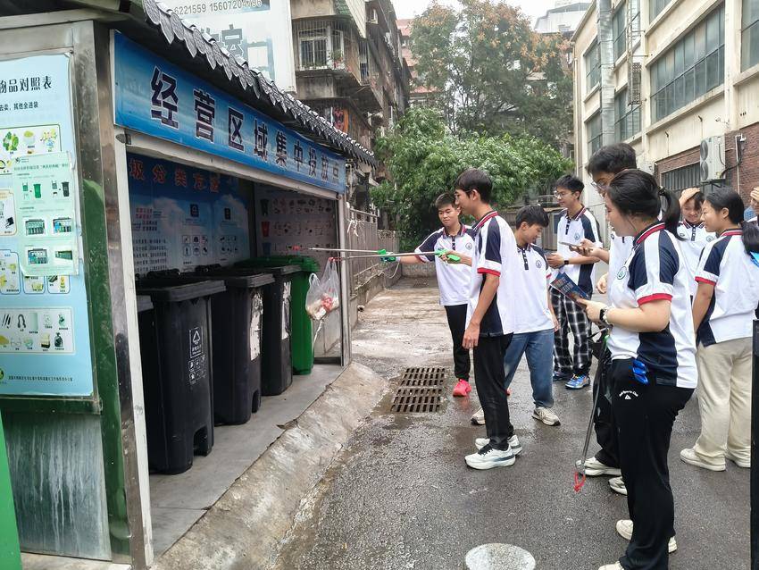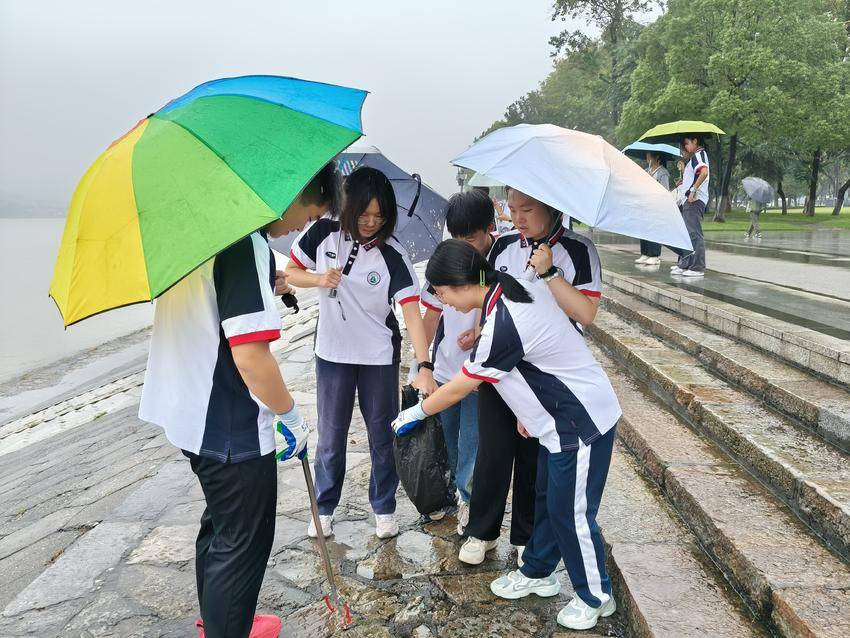 在“美丽家园”环保行动中,同学们分工协作,冒雨捡拾社区各个角落的垃圾。雨水打湿了衣鞋,他们却干劲十足,认真清理每一处卫生死角,还向商户、居民发放垃圾分类宣传单页,号召大家共建整洁社区。