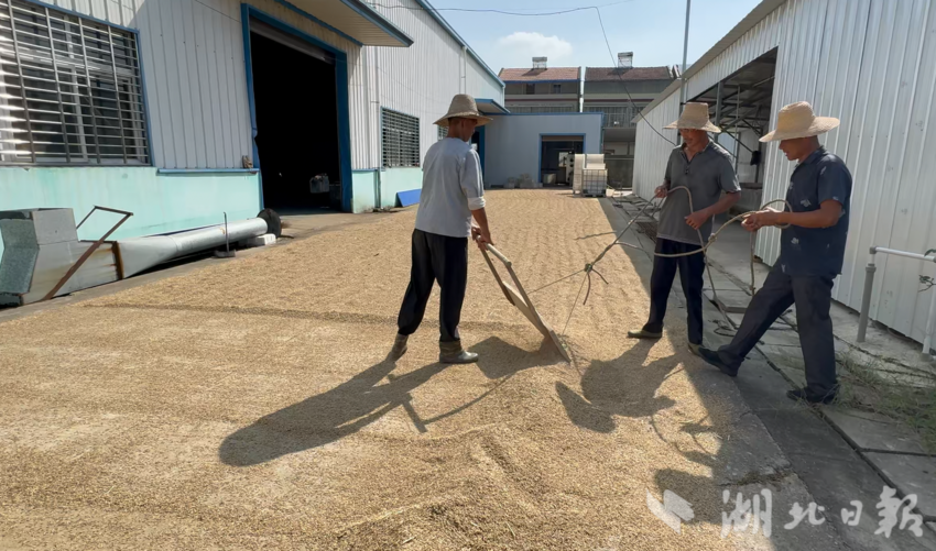 晾晒场上,一派忙碌景象更添丰收喜悦:工人们手持木耙,将刚收割的稻谷均匀铺开,秋日阳光洒在颗粒圆润的黑米上,泛着温润的光泽。自然晾晒是老手艺,也是保证‘华墨香’品质的关键一步。阳光带走水分,更赋予黑米独特风味与营养留存。