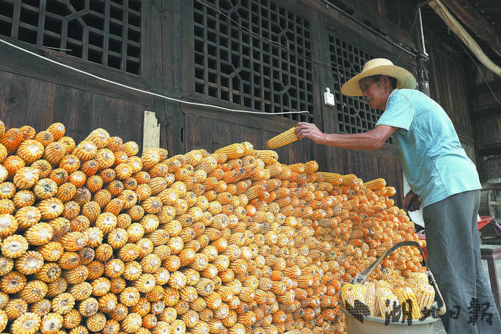 咸丰县坪坝营镇土司坝村村民翻晒玉米。
