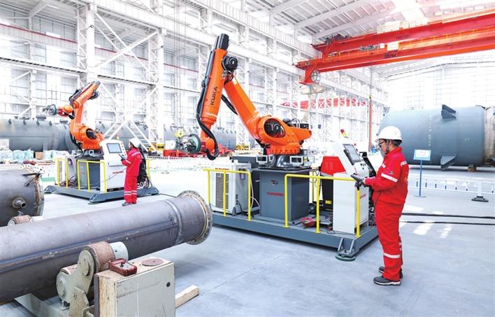 在准备车间,2万瓦激光切割机飞速运转,钢板在传送带上精准移动,27米长的数控火焰切割机伸展“长臂”,按照预设程序精准切割,12米双刀头全自动铣边机和相贯线切割机器人默契配合。整个系统自动完成钢板输送、定位、切割和坡口加工等一系列工序。“人均日加工钢材量可达15吨,相较于传统生产模式,效率大幅提升。”宜化化机设备制造分公司项目经理陈仁义介绍。
