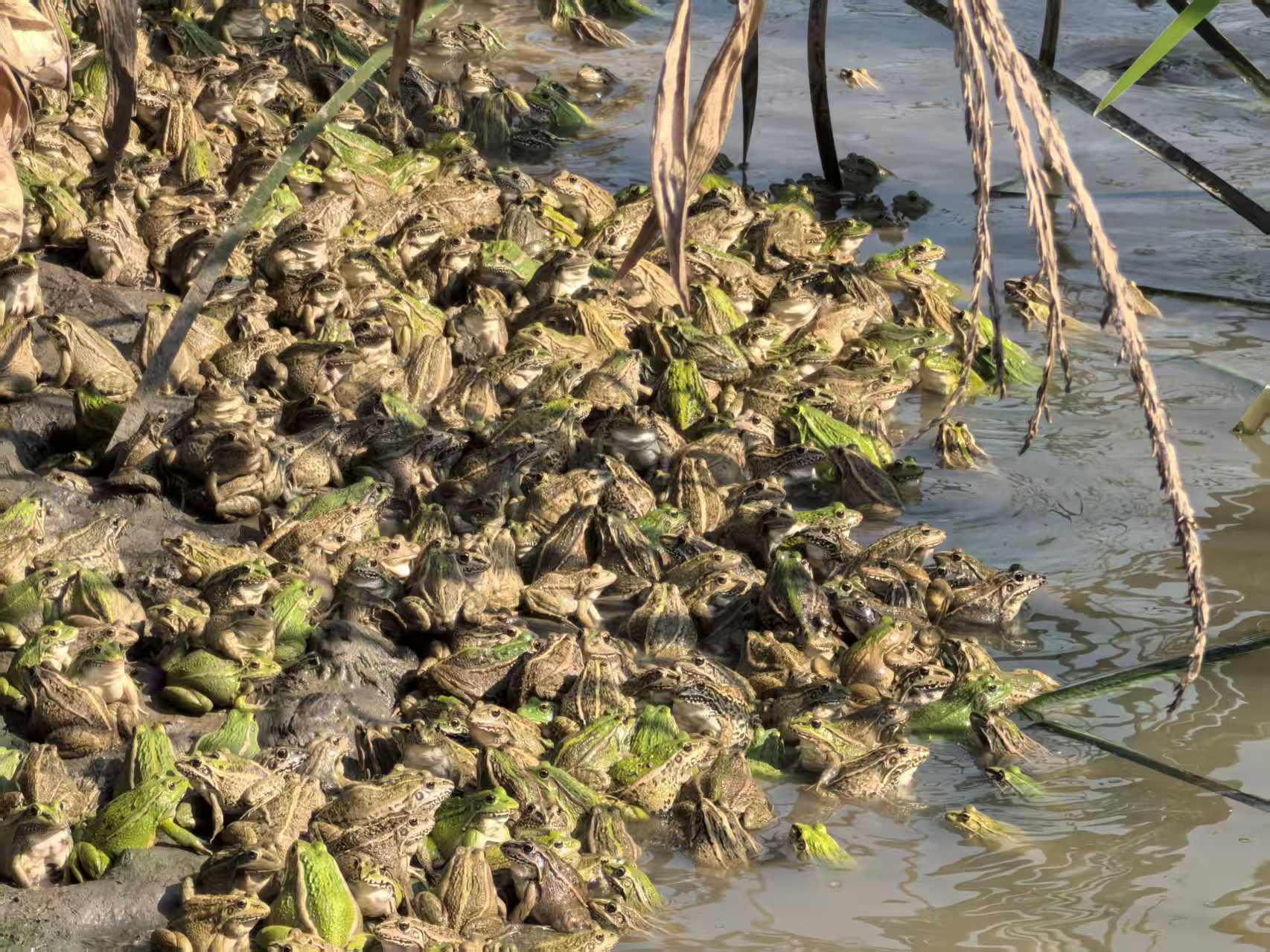 走进基地内,一片片“回”字形的蛙田错落有致,白色的纱网扎在四周,上方还有一层防护网,防止附近的飞鸟啄食青蛙。成群的青蛙在蛙田里跳跃嬉闹,悠哉进食,受到脚步声的惊扰后,不约而同地跳入水中,呈现出一派生机勃勃的热闹景象。
