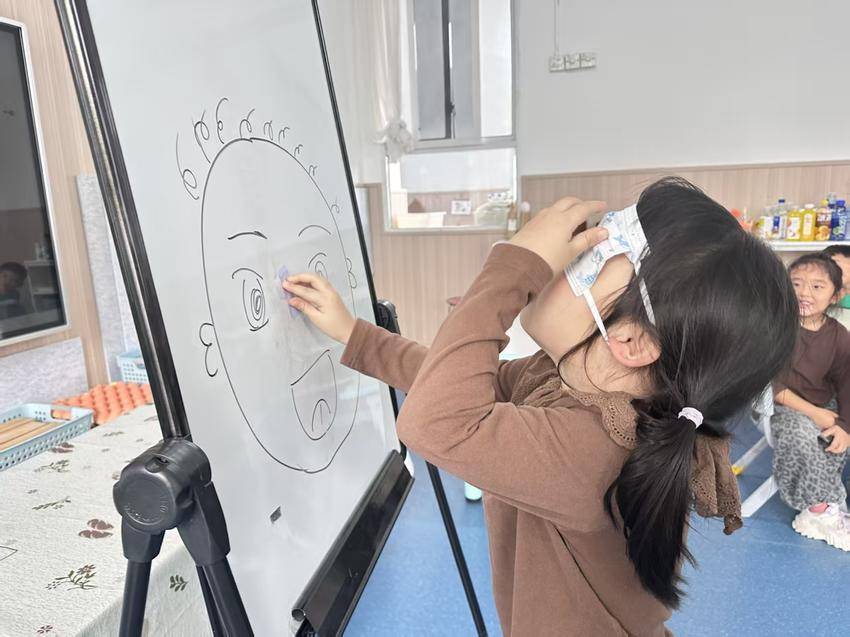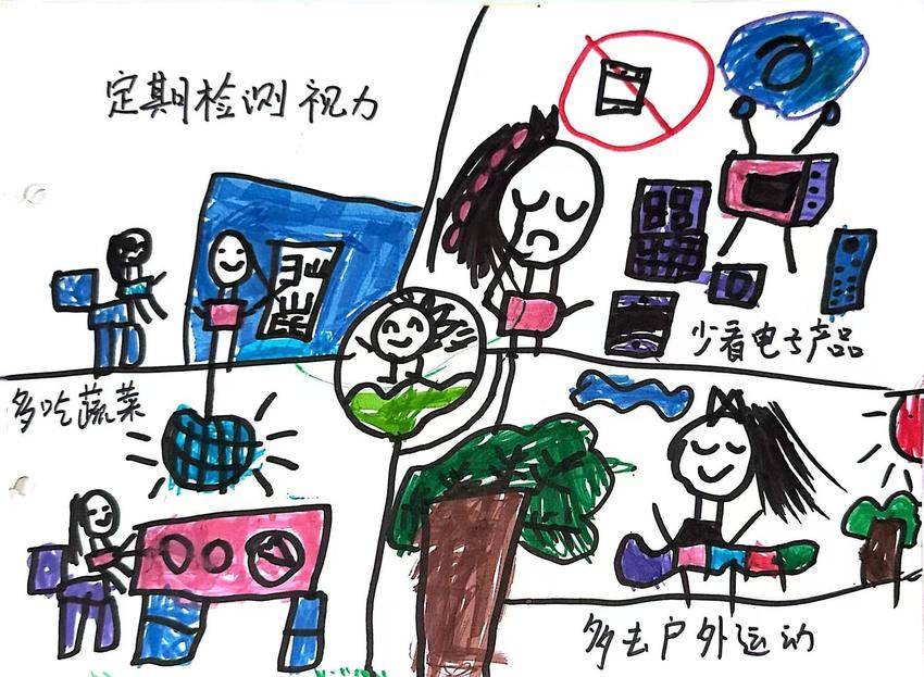活动中,小班聚焦“感知眼睛功能”,教师蒙住幼儿眼睛,引导其通过触摸积木、闻嗅水果猜测物品,再睁眼验证,直观感受“眼睛能看清形状与颜色”;随后教唱“小眼睛,眨呀眨,爱护它,不揉它”的护眼儿歌,搭配动作加深记忆。中班侧重“养成护眼习惯”,通过“胸口离桌一拳”等“三个一”口诀教学,结合玩偶演示正误坐姿对比,让幼儿掌握正确读写姿势;同时启动“护眼小督察”行动,幼儿轮流上岗提醒同伴,好习惯者可获星星贴纸奖励。大班直击“深化护眼认知”,用动画解析电子产品伤眼、户外活动护眼的简单原理,借助卡通视力表教幼儿指认方向;户外开展“找信号”“云朵变变变”游戏延长远眺时间,还通过“盲人贴鼻子”体验失明不便,最后幼儿用图画自制护眼手册分享心得。