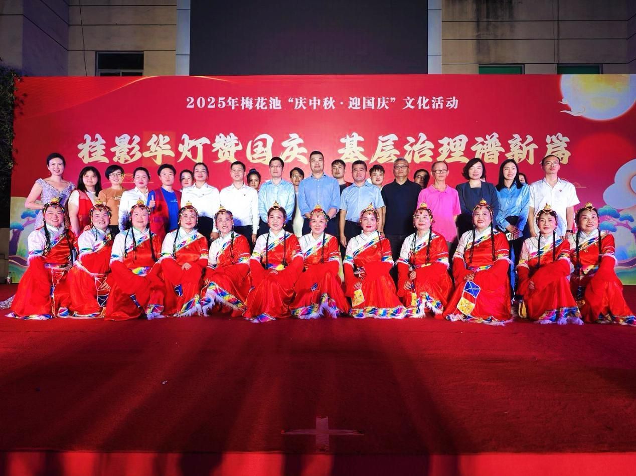 在梅花池社区主办、将军路文旅产业发展公司承办的“桂影华灯赞国庆,基层治理谱新篇”双节文化活动上,翠林音韵合唱团合唱《我和我的祖国+壮美延安》开场,《月光下的祖国》《祝福祖国》《万疆》《越来越好》《藏舞吉祥欢歌》《情牵银龄,爱传万家》和川剧变脸等多种节目依次上台。社区依托企业摆台阵地,开展现场招聘服务,集中发布企业岗位需求。