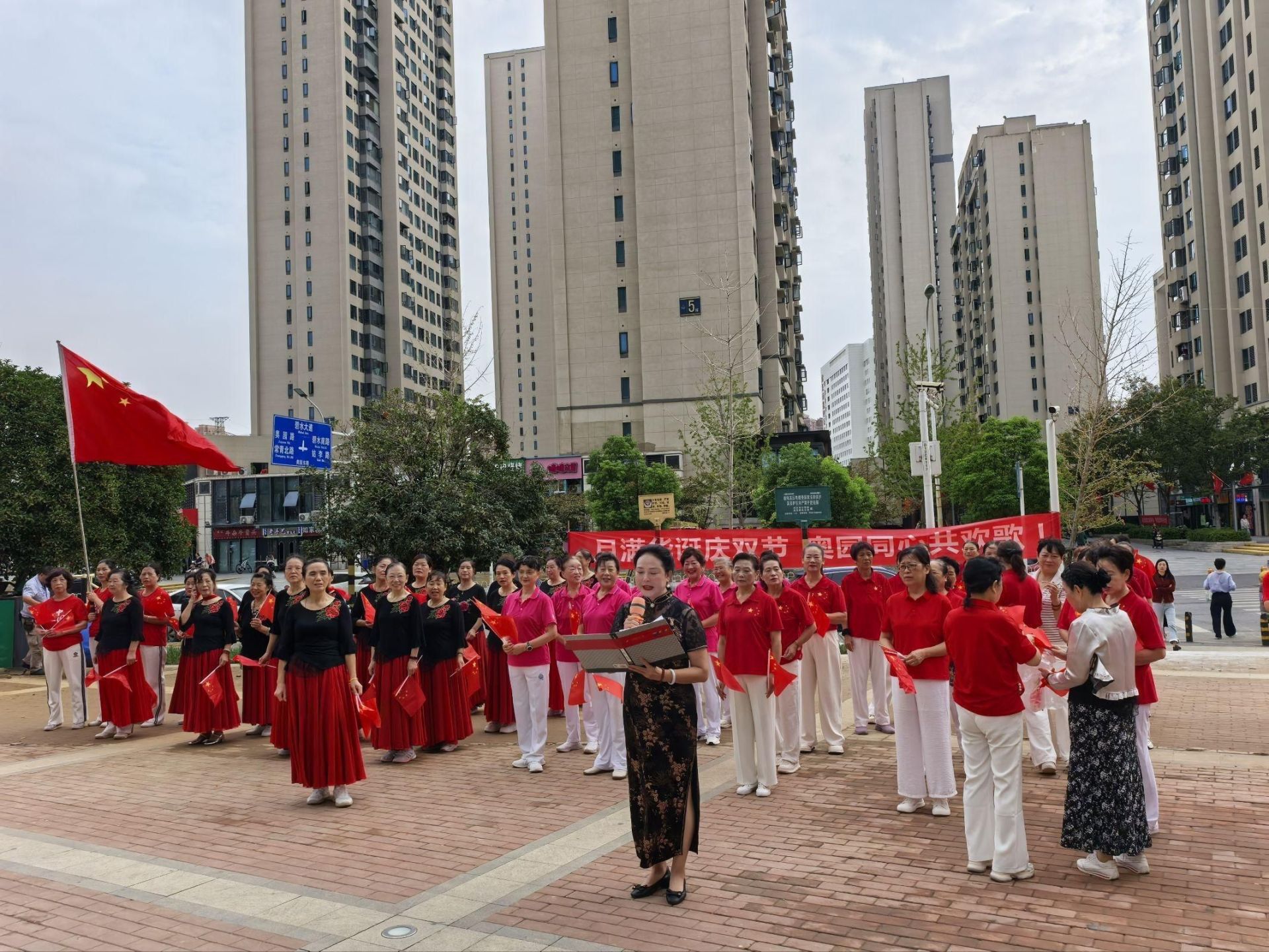 美联四期广场上,奥园社区合唱团的成员们身着统一的红色礼服,精神矍铄,歌声洪亮深情。舞蹈队阿姨们以柔美的身姿,演绎着舞蹈《走向复兴》,《龙船调》中舞蹈队围绕着红旗,诠释着对祖国的依恋与自豪。