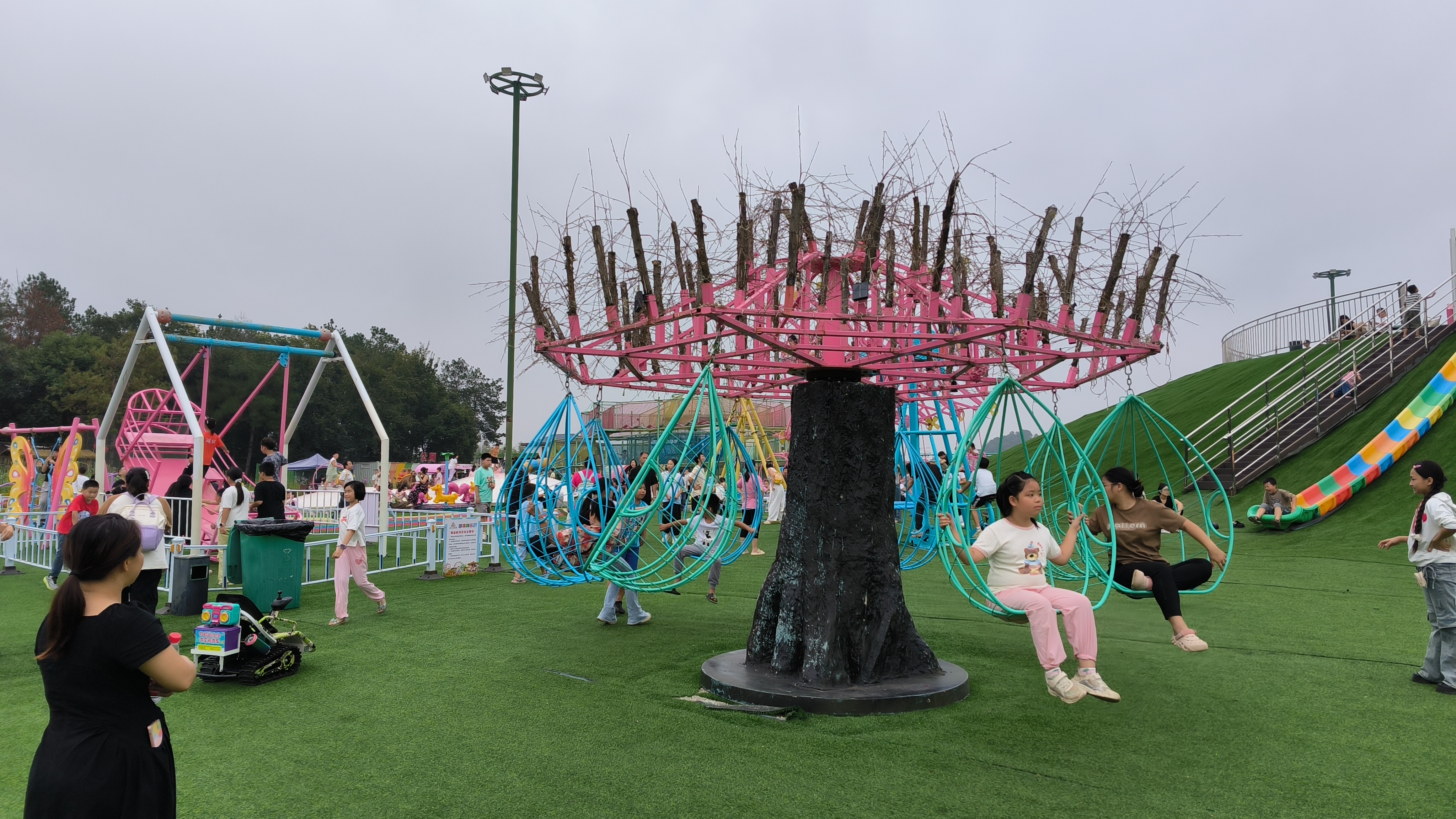 广东畈村的哆来咪宾果游乐园,宛如从自然中生长的童话秘境——成片桃树、橙树交织成天然绿幕,将外界喧嚣轻轻隔绝。园内,色彩明丽的旋转飞机缓缓升空,座舱里孩童的笑声随气流飘散;十余米长的长龙秋千人气鼎盛,十几位游客同乘其上,荡起时如一道弧线划破天际,尖叫声与欢笑声交织成银铃般的乐章,在园区上空久久回荡。