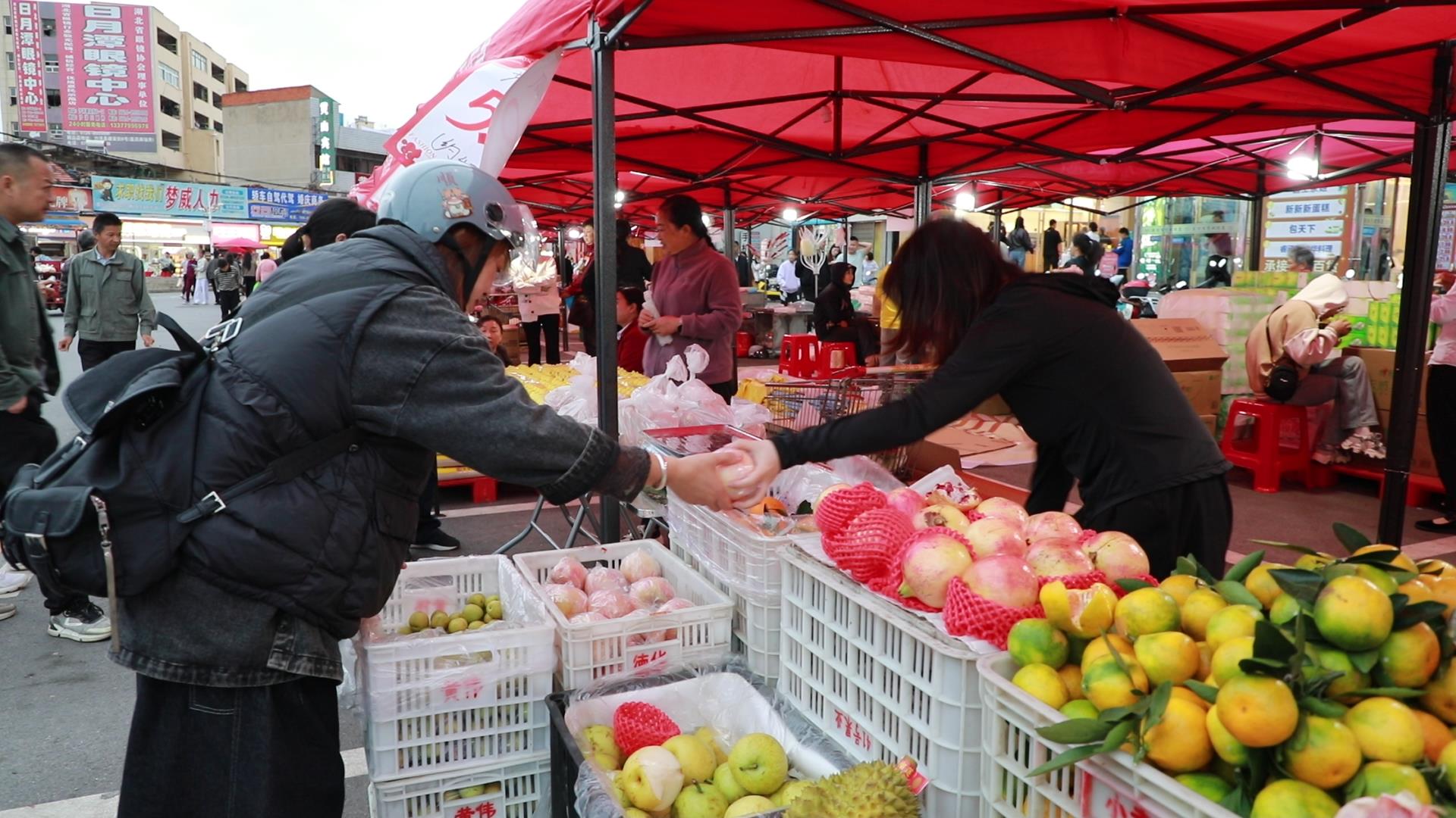 “这个黄桃又脆又甜,我要多买点回去。”正在挑选水果的市民李女士笑着说,“大集上吃的、用的都有,价格也实惠,真是太方便了。”