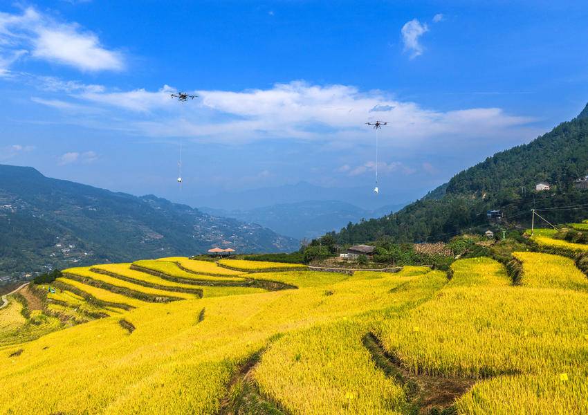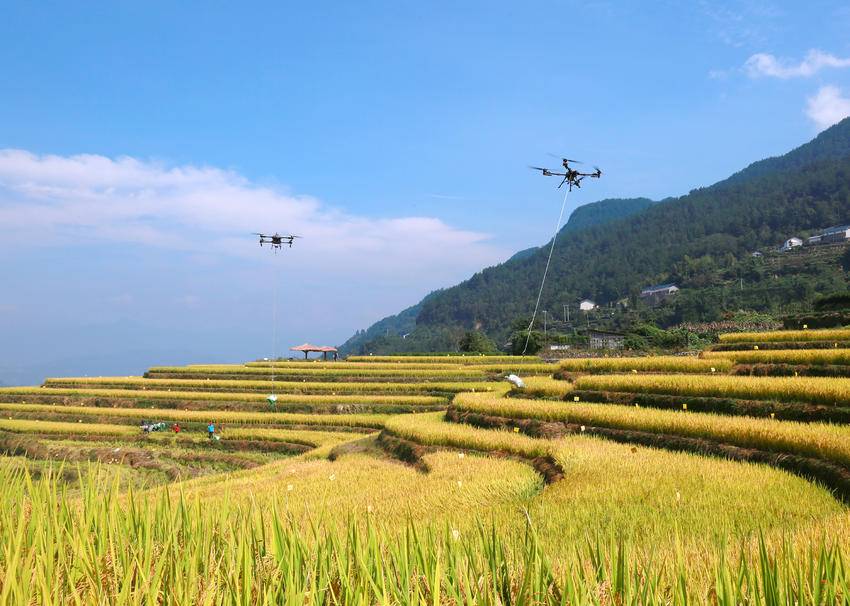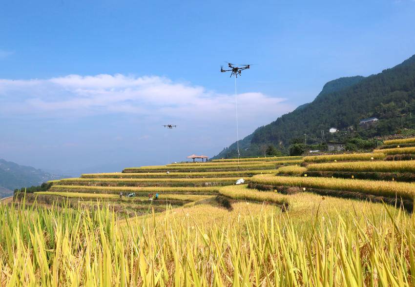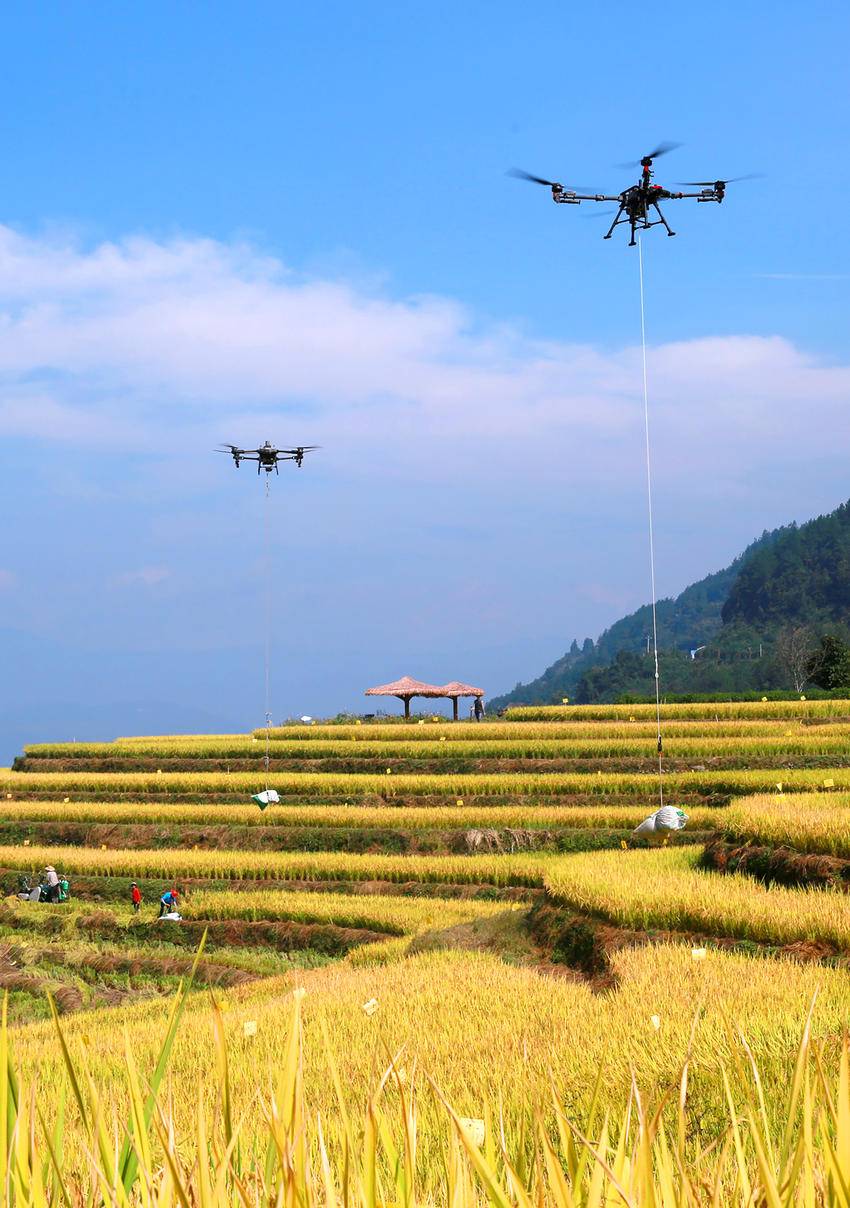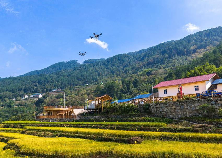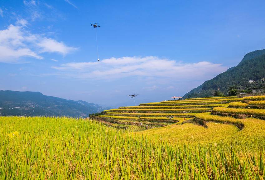 10月10日,秭归县沙镇溪镇长春村村民用无人机转运刚收获的高山冷水稻。