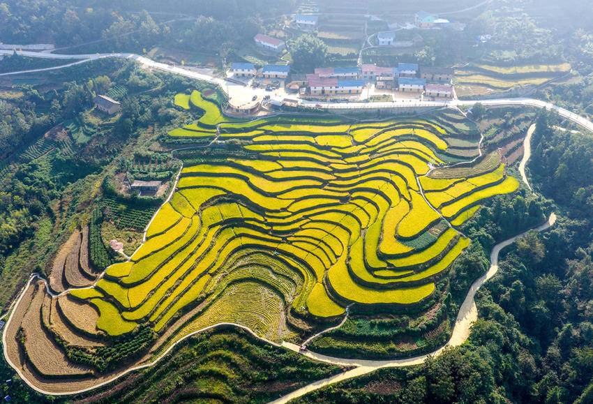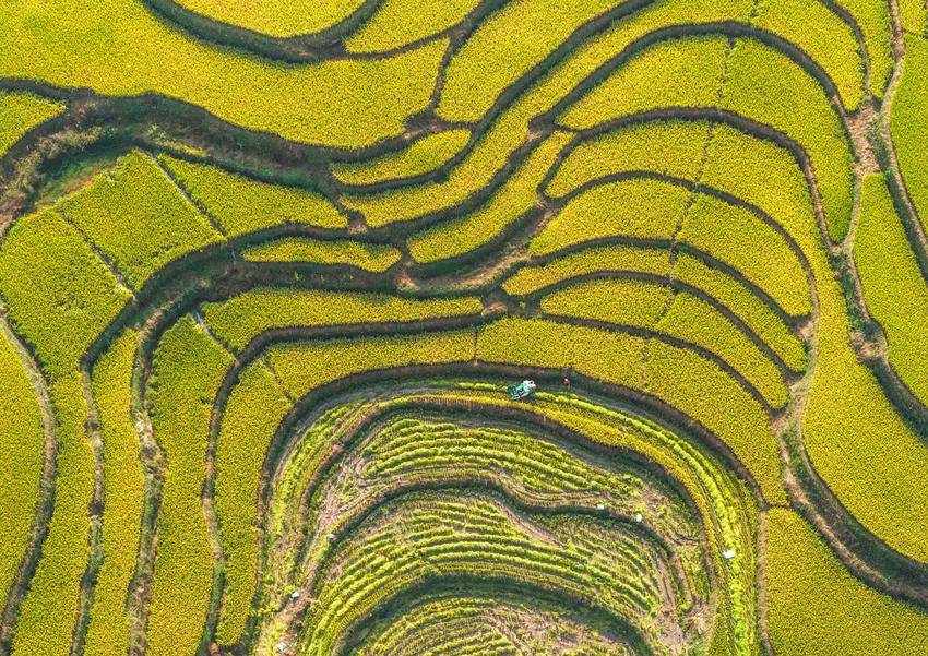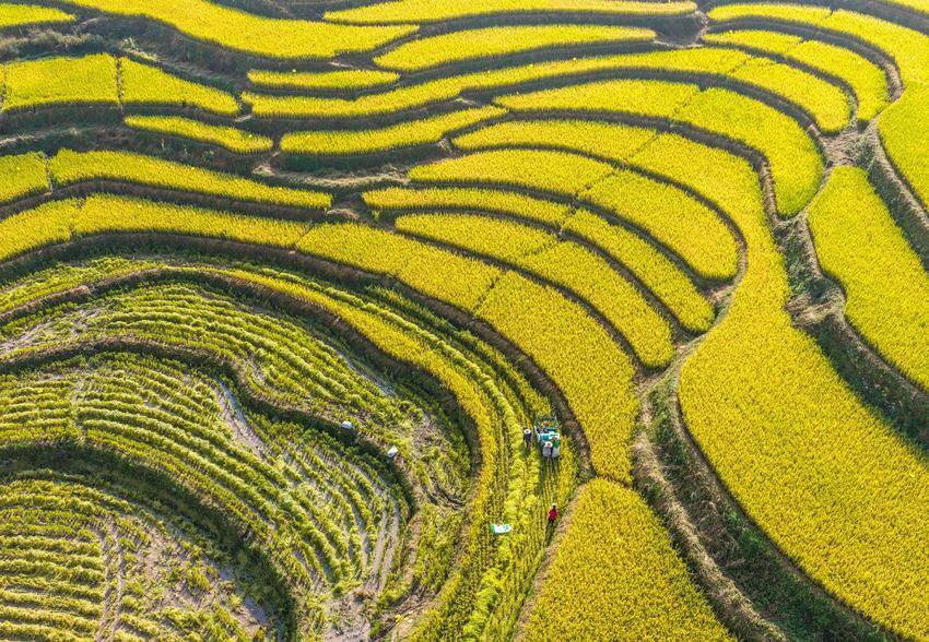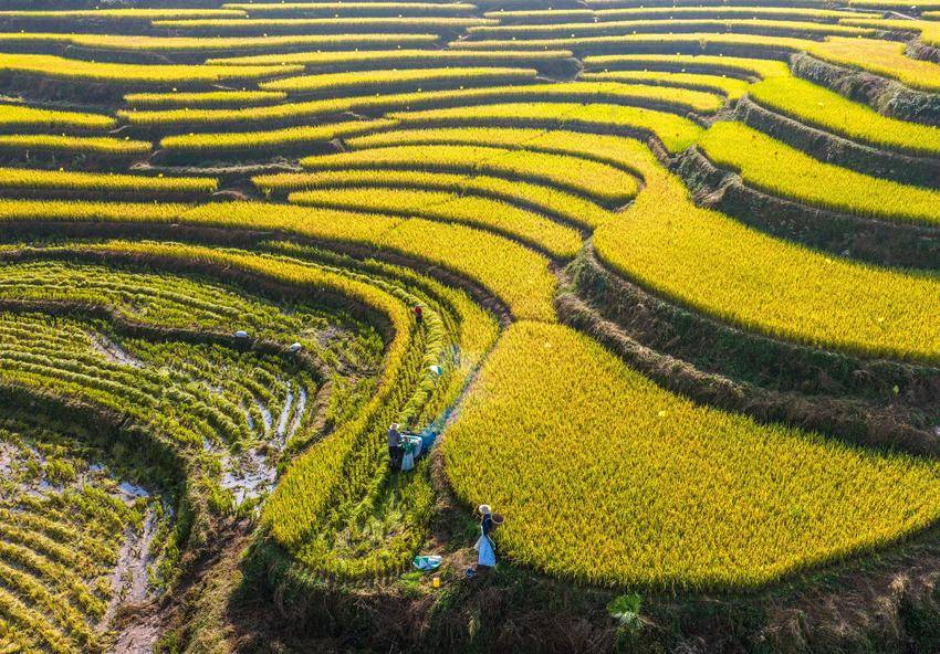 湖北日报客户端讯(通讯员王罡、郑可欣)时下,湖北省宜昌市秭归县高山冷水稻进入收获季。当地农民采用收割机、无人机等进行收割、搬运、贮藏,确保秋粮颗粒归仓,田间地头一派忙碌景象。层层叠叠的梯田、穿梭稻田的机器与翻修一新的民居构成了一幅美丽的现代乡村新画卷。冷水稻是用当地高山冷泉水灌溉稻田而发展的特色农产品,以其高品质深受市场青睐。