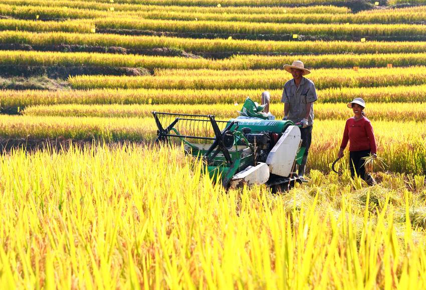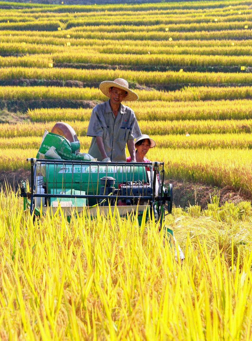 10月10日,秭归县沙镇溪镇长春村村民驾驶农机在田间收获高山冷水稻。