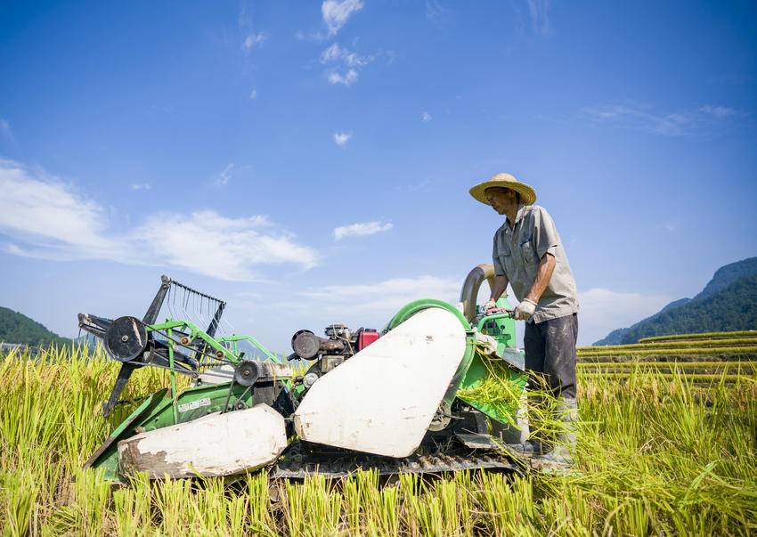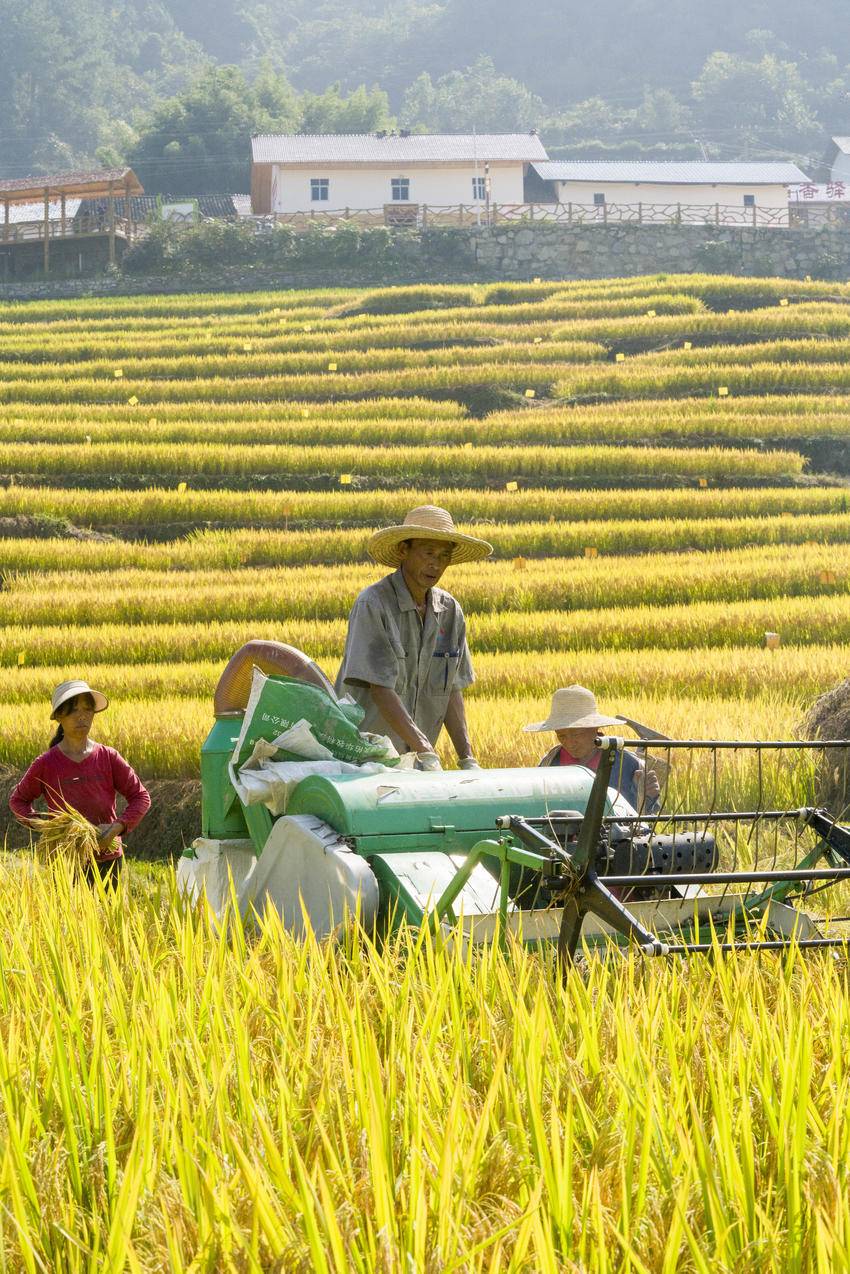 10月10日,秭归县沙镇溪镇长春村,农户使用收割机采收冷水稻。