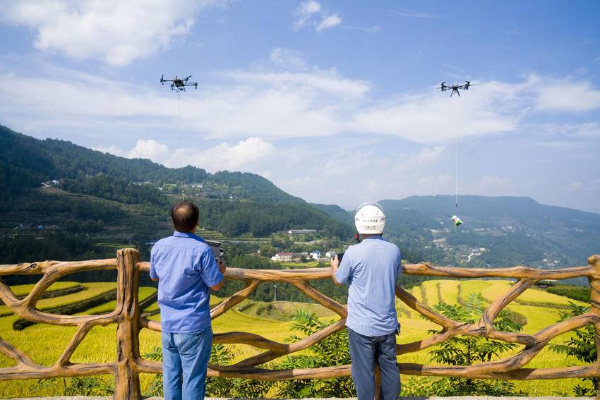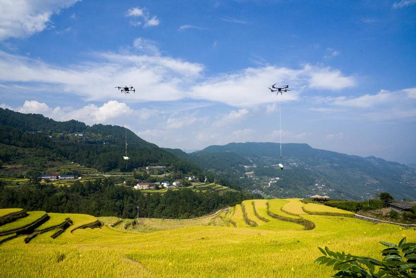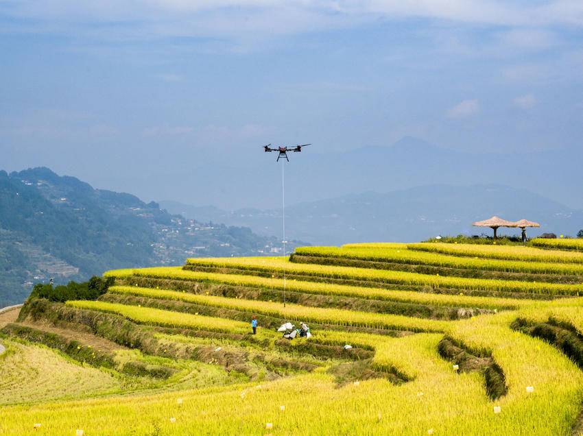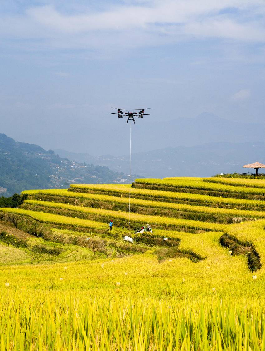 10月10日,秭归县沙镇溪镇长春村,农户使用无人机吊运采收的冷水稻。