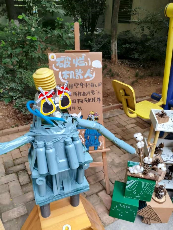 “这些作品都是社区志愿者利用业余时间制作的,”活动发起人吴海燕介绍道,“有妈妈们用孩子穿不下的牛仔裤做的玩偶,有用捡来的木片拼贴的蝴蝶,还有小朋友自己动手组装的塑料瓶机器人。”