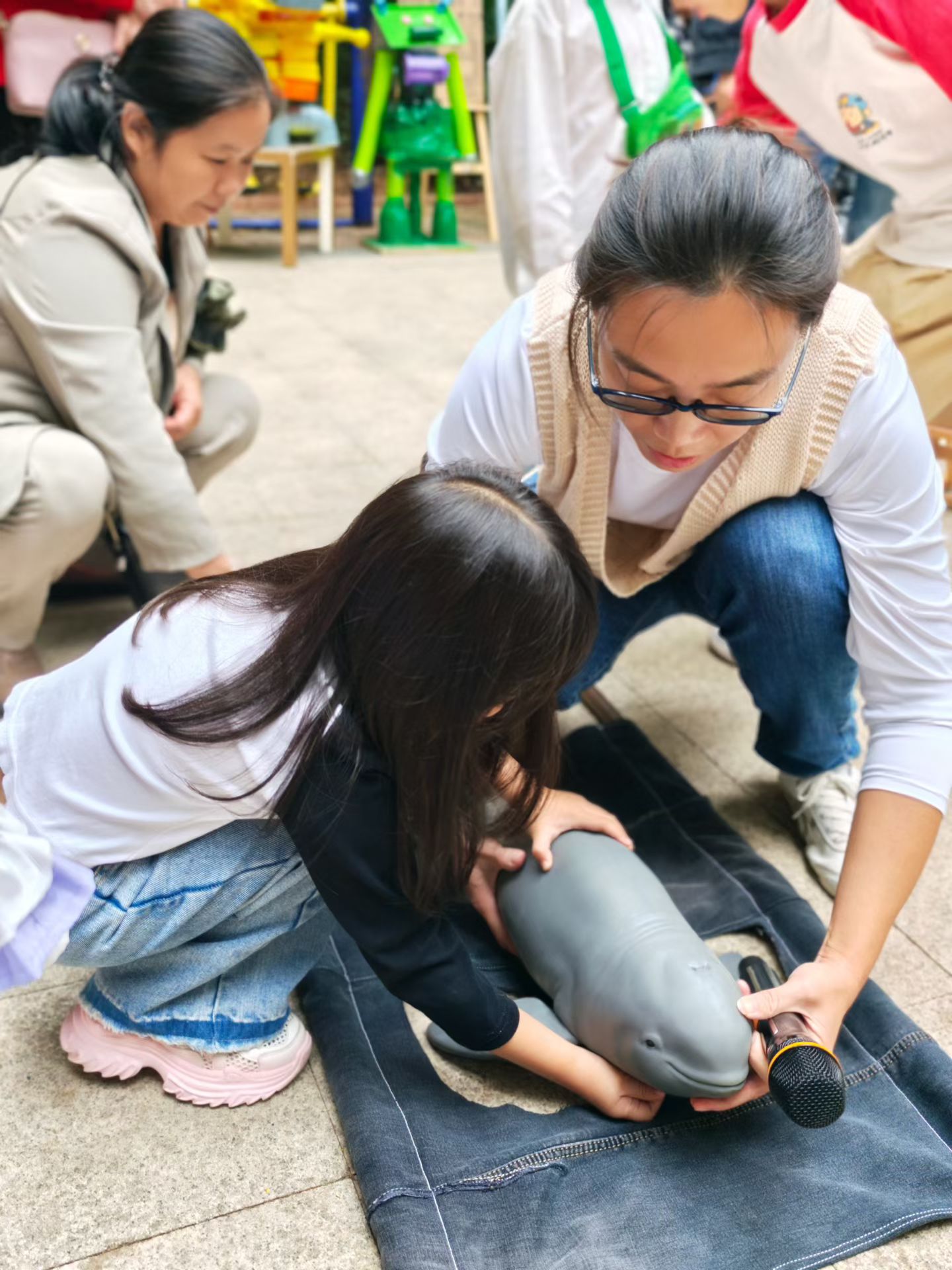 现场,一比一复刻的江豚模型成为全场焦点,由湖北省长江生态保护基金会支持的这项展品,把“微笑天使”带到孩子们身边,让孩子们能够近距离观察江豚、了解江豚,通过现场模拟学习如何正确救助受伤的江豚。