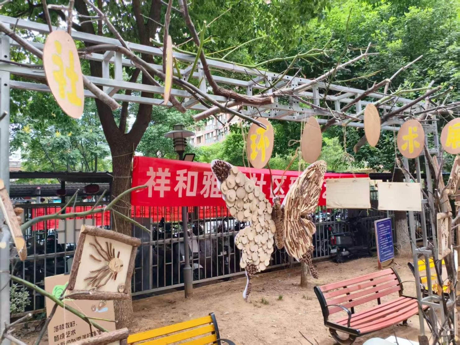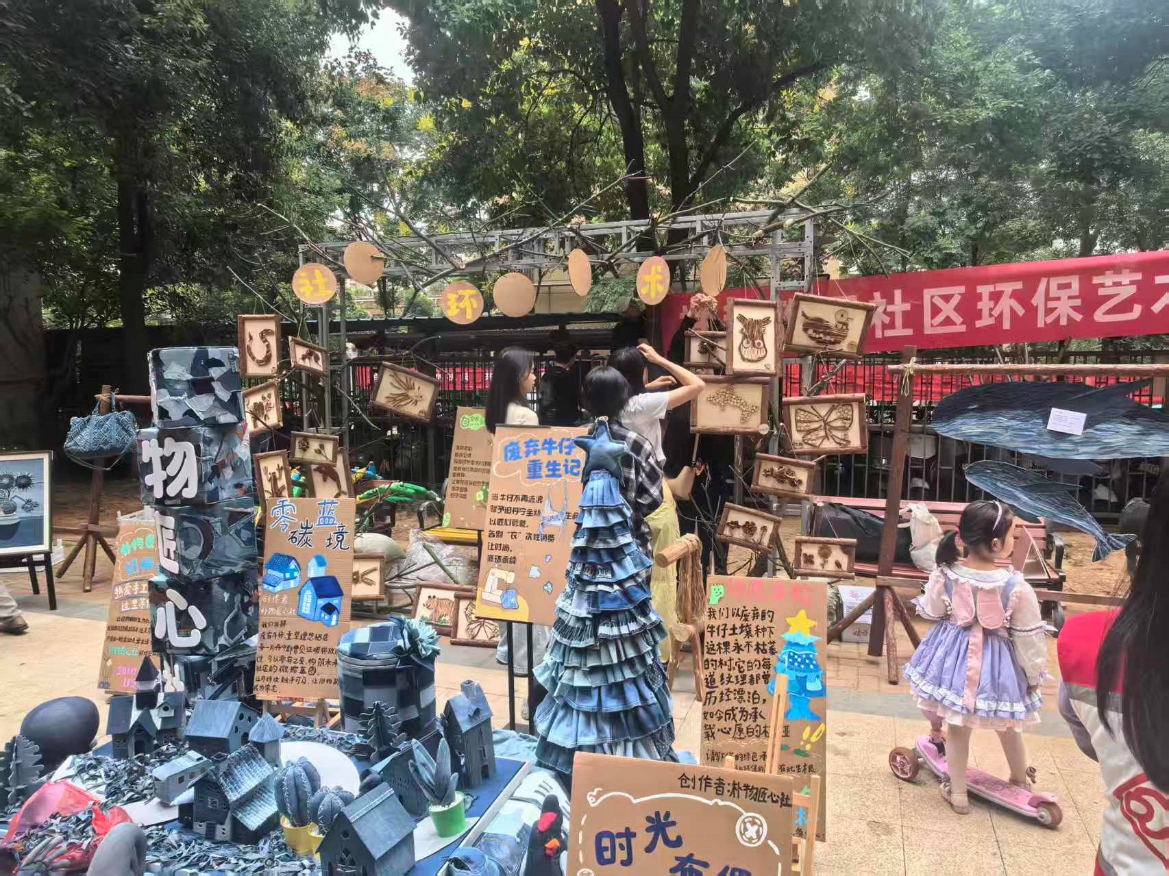 近日,在武汉东湖高新区关东街成园小区,一场“变废为宝”的环保艺术展拉开帷幕。在零碳美好社区服务中心工作人员组织下,志愿者们在社区门口摆满了手工艺品,既有用废牛仔手工制作的玩偶,也有用废弃树枝切片制成的大蝴蝶,琳琅满目的环保手工作品排列整齐。