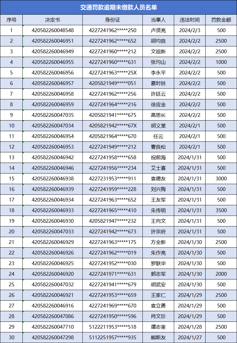 交通罚款逾期未缴款人员名单