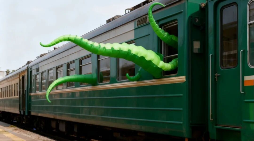 2、巨型童趣充气玩偶:本届亮点! 一辆停靠在稻田边的复古火车,正被一只顽皮的巨型充气八爪鱼“突袭”——它那柔软又巨大的彩色触角,俏皮地从车窗里伸展开来,仿佛正与火车嬉戏打闹,为宁静的田园注入超现实的梦幻童趣。