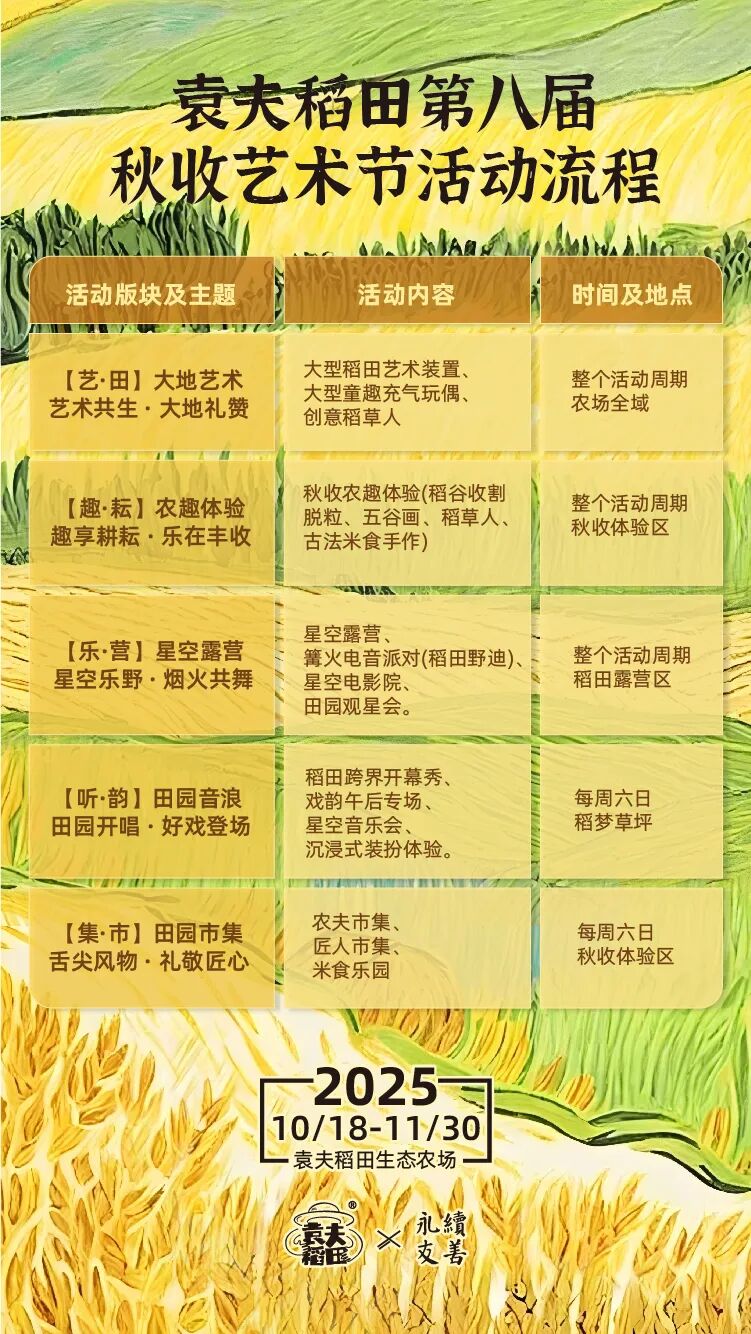 「10.18-11.30日」,第八届袁夫稻田秋收艺术节如期而至,邀你共赴一场为期44天的自然与艺术之约。