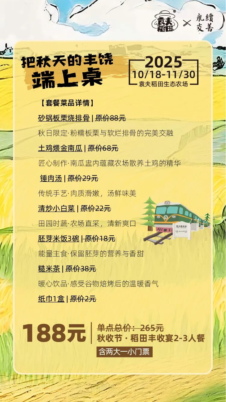 火车餐厅·秋收限定:当复古绿皮火车静静停靠在金色稻浪中,车窗内正上演着一场秋日限定的味觉盛宴。我们甄选当季最新鲜的食材,将田野的馈赠化作温暖人心的料理。