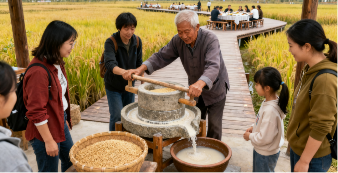 古法米食手作:石磨低吟,米香四溢,亲手将新米磨浆,再制成丝滑的米奶与软糯的豆粑,品尝源自土地与时间的甘甜