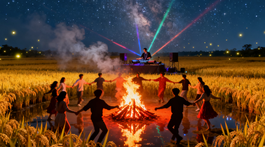 当夜幕降临,稻田便切换至“狂欢模式”。