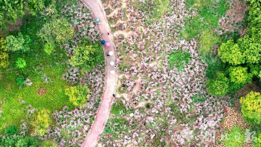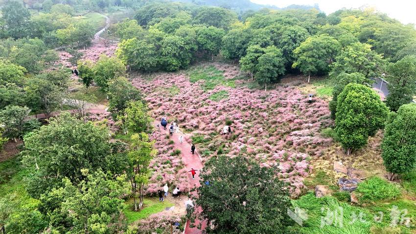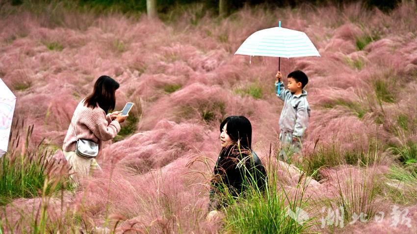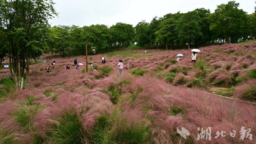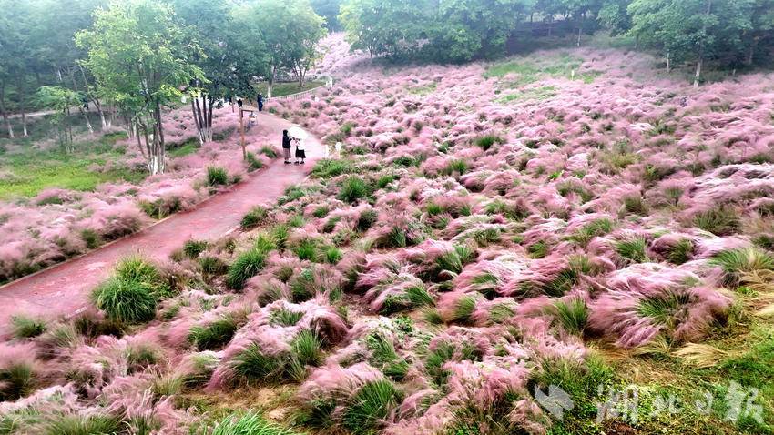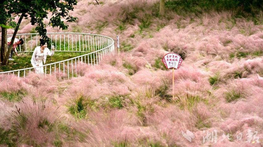 郧阳区中华水园的粉黛花海是秋日限定浪漫,最佳观赏期为10月中旬至11月上旬,成片的粉黛乱子草如粉色云雾般梦幻。