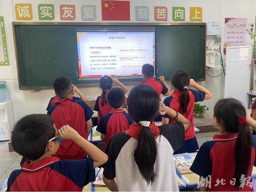 活动最后,各班少先队员全体起立,面对队旗庄严宣誓:“我是中国少年先锋队队员……准备着:为共产主义事业贡献力量!” 铿锵有力的誓言在教室里回荡,彰显着汉正小学少年儿童听党话、跟党走的坚定决心。