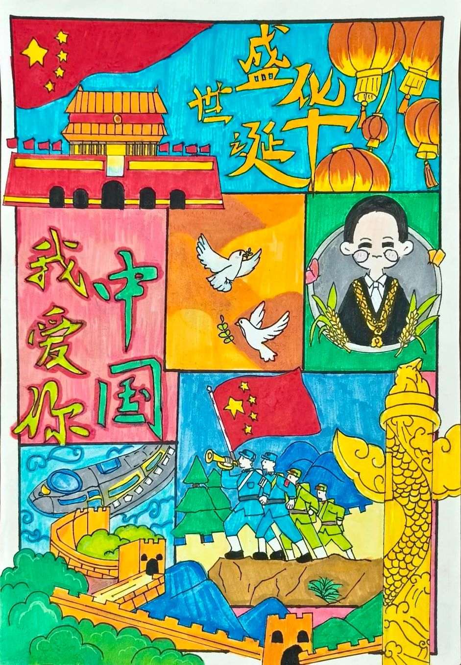 队员们用五彩画笔描绘对祖国和少先队组织的热爱,火箭、红旗与和平鸽相映成趣。