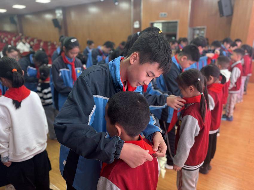 当日,黄花小学少先队又迎来一批新鲜血液,六年级的老队员为一年级的新队员戴上鲜艳的红领巾,热烈欢迎他们加入少先队。随后在大队委的带领下,举起稚嫩的拳头,在庄严宣誓声中,成为了一名真正的少先队员。