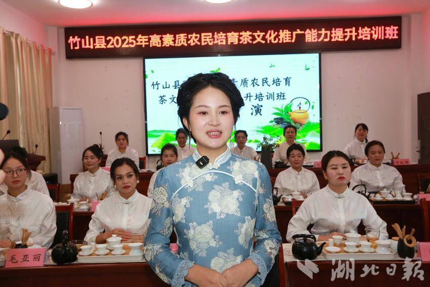 湖北日报客户端讯(通讯员陈昌荣、吕慧慧)秋意渐浓,竹山的数万亩茶园依然绿意盎然。10月12日,一场别开生面的“茶文化特色课堂”成果展演在竹山县宜品茶叶有限责任公司农民田间学校热烈举行,为为期10天的高素质农民培育和茶文化推广能力提升培训画上了圆满句号。空气中弥漫着醇厚的茶香,40余名来自各乡镇的涉茶企业主体、合作社女青年和技术员脸上洋溢着收获的喜悦,她们不仅是学员,更是竹山茶产业未来的“星星之火”。