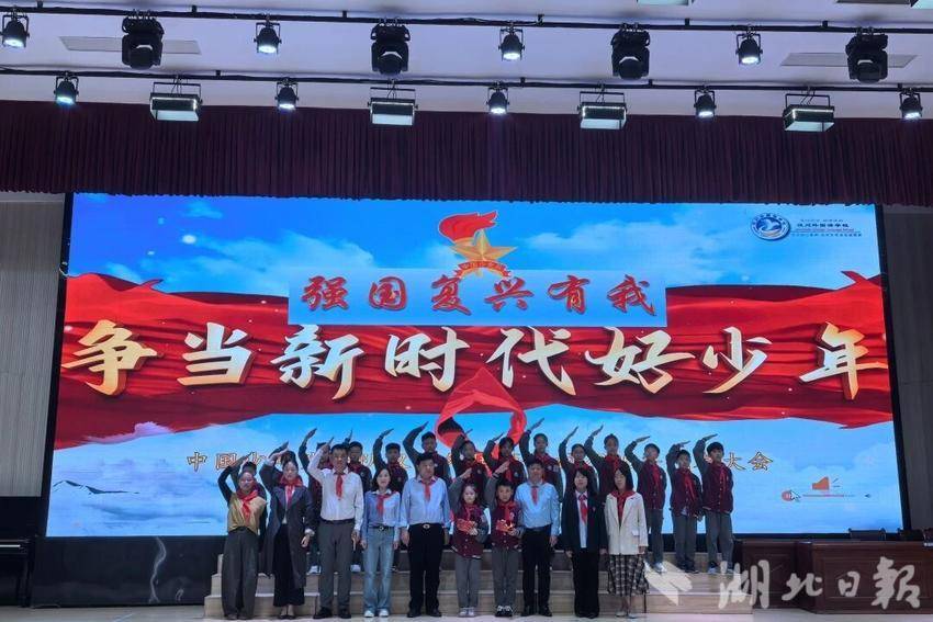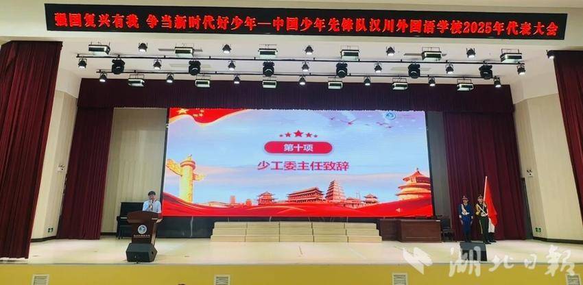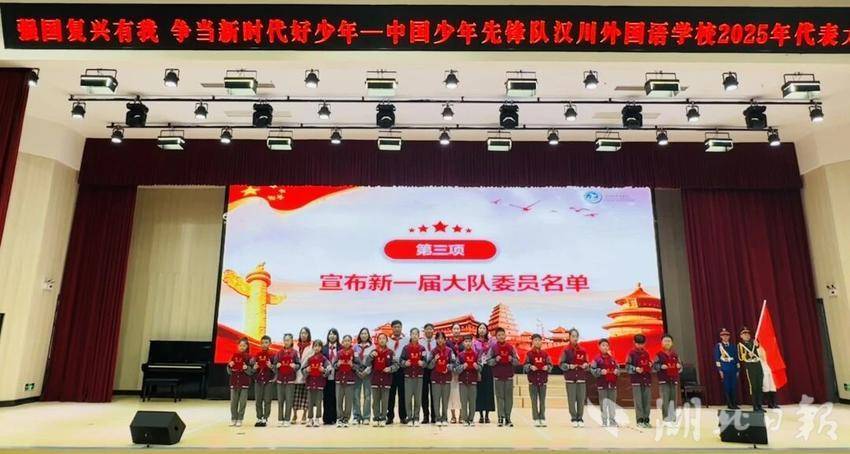 湖北日报客户端讯(通讯员钱洁、廖红亮、付佳)10月12日,汉川外国语学校金杏报告厅内队旗招展、歌声嘹亮,中国少年先锋队汉川外国语学校2025年代表大会在庄严而热烈的氛围中隆重举行。学校少工委委员、辅导员代表以及四年级全体少先队员齐聚一堂,共同见证这一承载着光荣与使命的重要时刻,以昂扬的姿态践行“强国复兴有我,争当新时代好少年”的铮铮誓言。